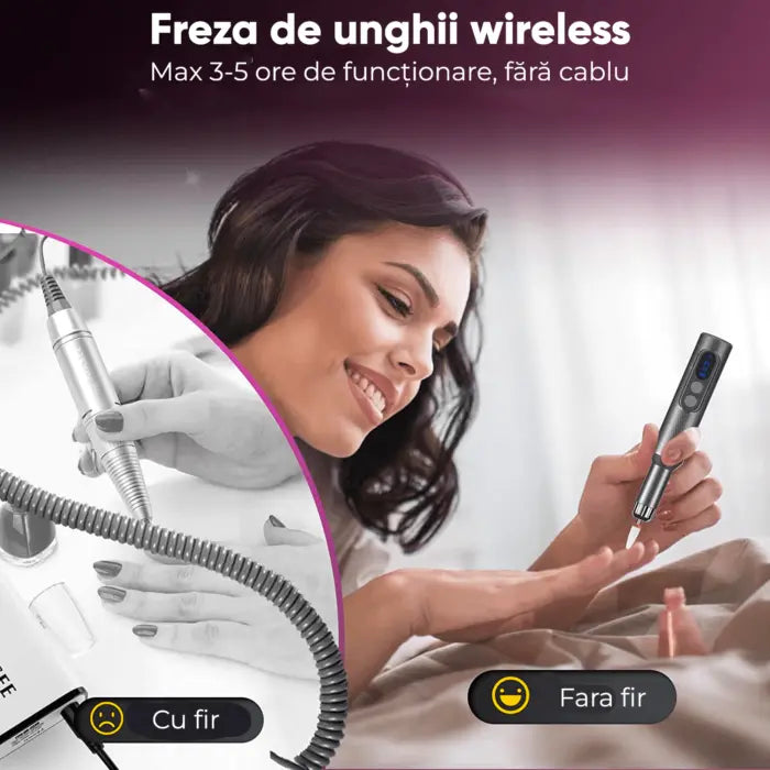 Freză unghii profesională wireless, 18.000 RPM, 12 capete, 36 benzi de șlefuire, roz