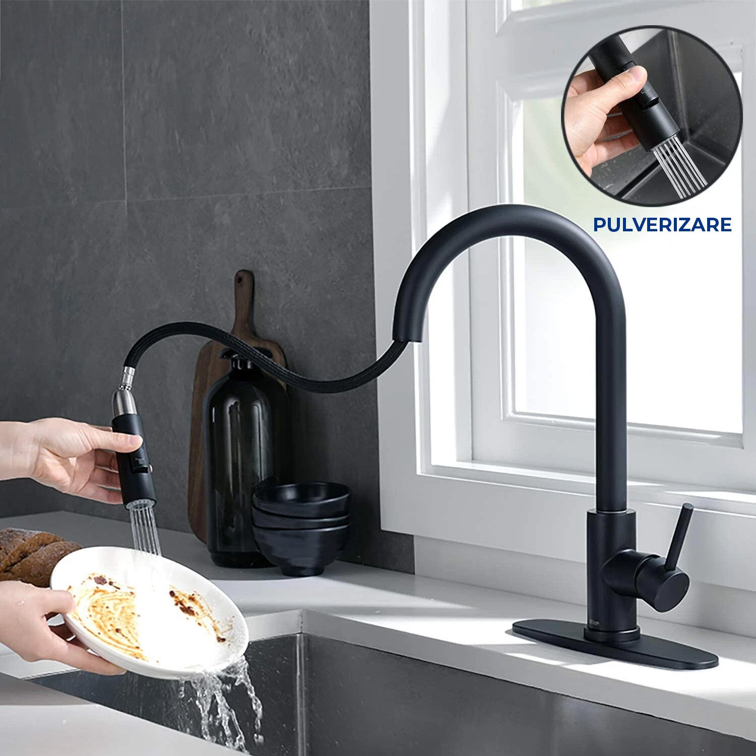 baterie bucatarie Elindor®, baterie neagra cu dus extractibil, baterie monocomanda moderna, baterie chiuveta 360°, baterie otel inoxidabil, baterie bucatarie anti-pete, baterie design minimalist, baterie rotativa cu jet dublu