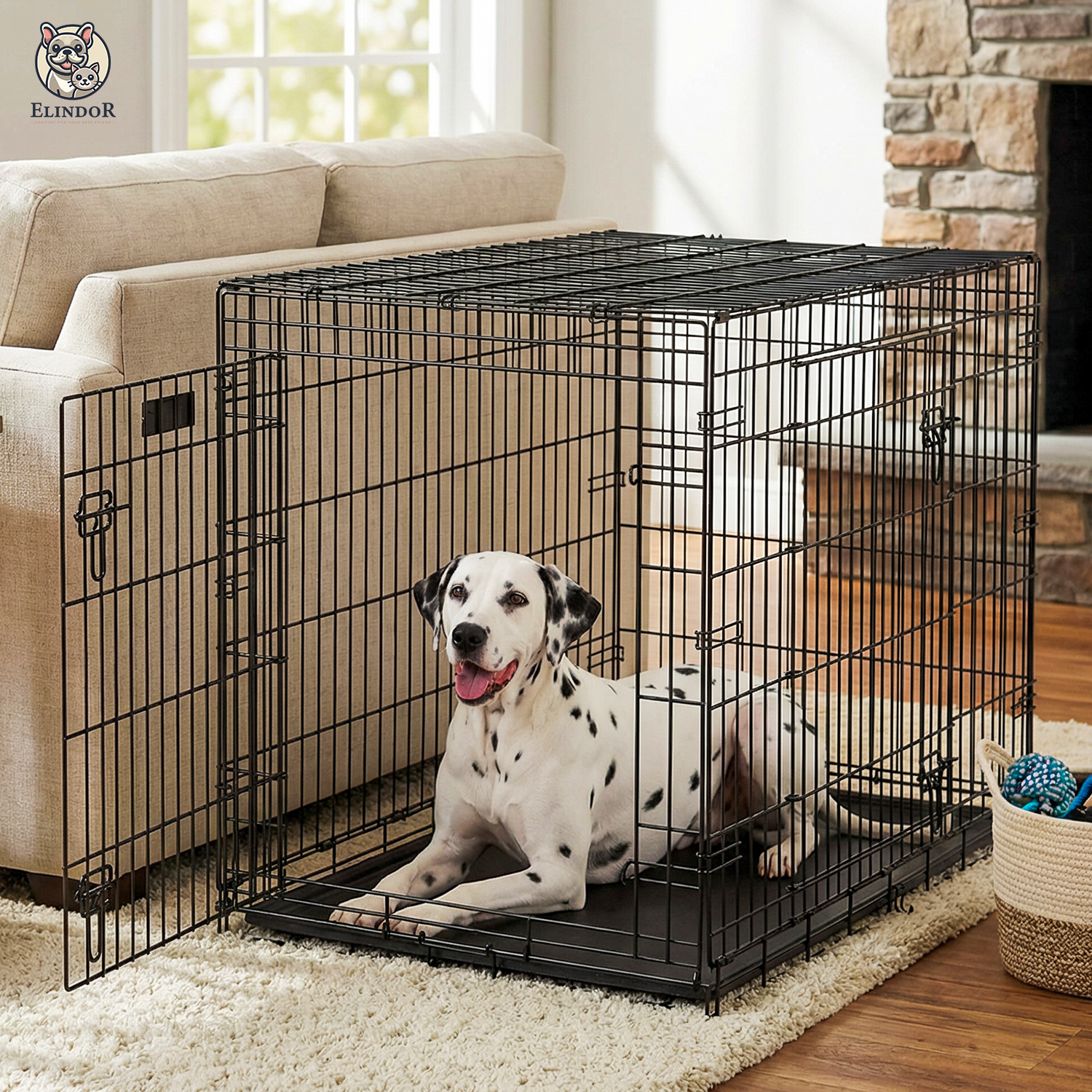 Cusca pentru Caini Elindor® – Pliabila, Metalica, 2 Usi cu Sistem de Blocare, Tava Detasabila, pentru Interior si Transport, Negru (91 × 56.5 × 64.5 cm)