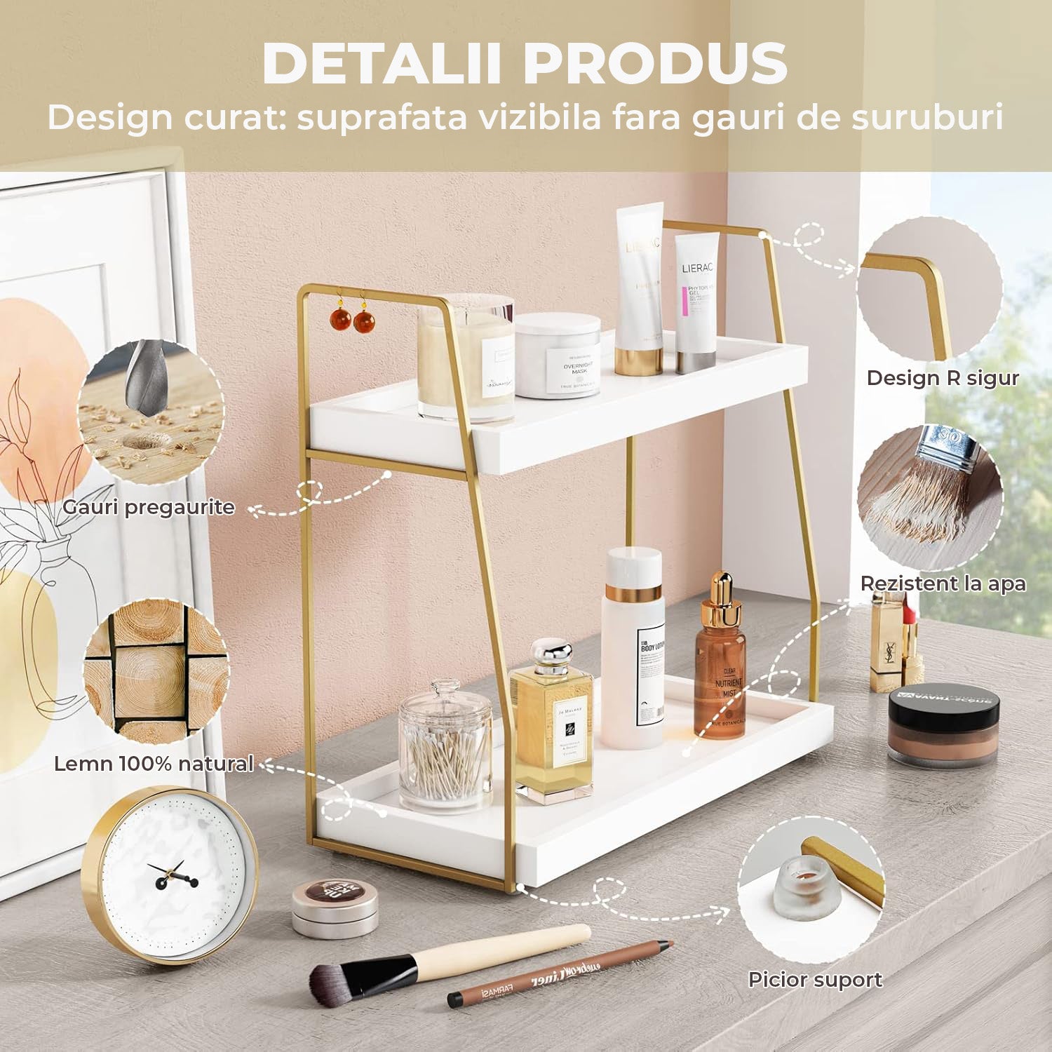 organizator baie blat, raft baie 2 niveluri, suport cosmetice, organizator masa machiaj, suport parfumuri, raft depozitare alb auriu