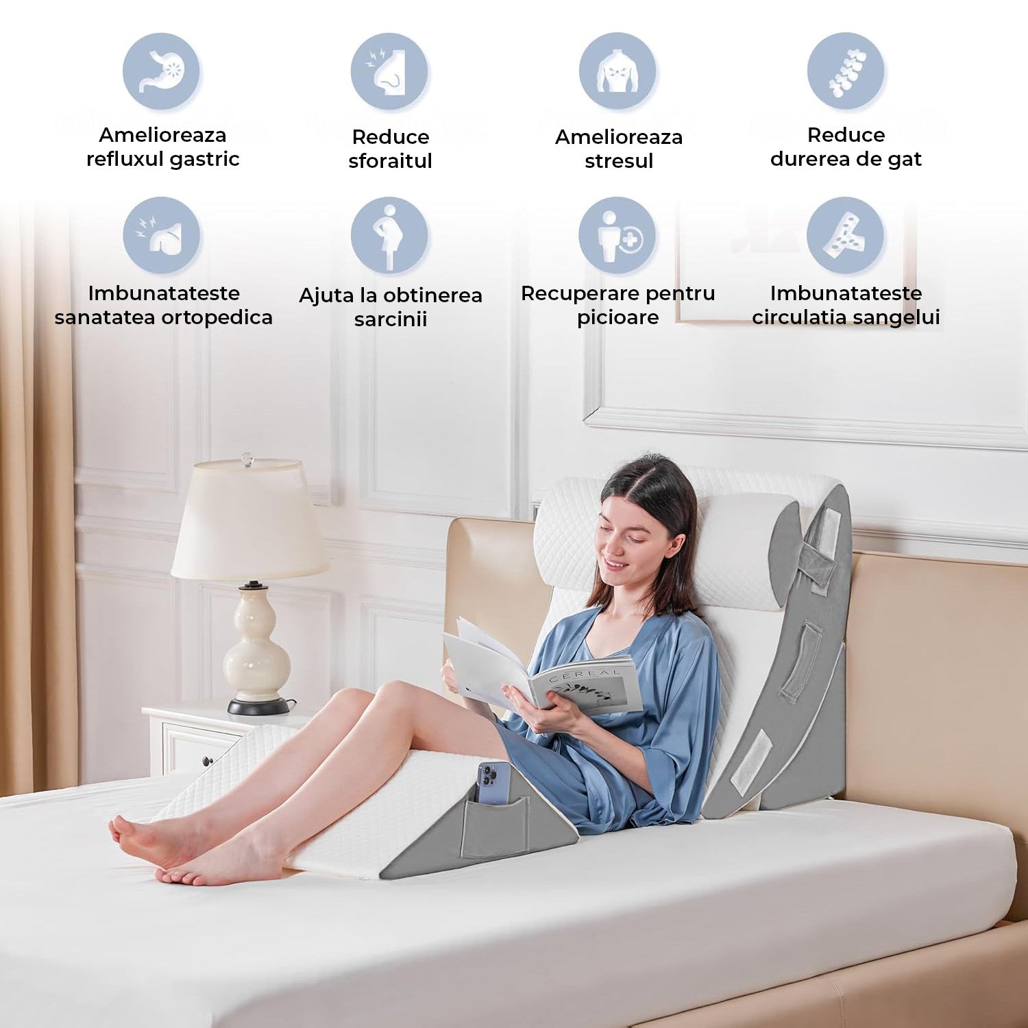 Este recomandat pentru sustinerea spatelui, gatului si picioarelor, reducerea refluxului gastric, ameliorarea durerilor lombare si confort post-operator.