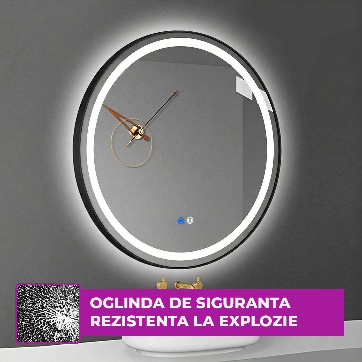 Pentru utilizare confortabila in baie, oglinda dispune de functie anti-aburire rapida, mentinand suprafata clara chiar si in conditii de umiditate ridicata. Constructia include sticla securizata temperata, cu claritate ridicata (CRI 90+) si protectie impotriva spargerii. Rama este realizata din metal durabil, rezistent la umiditate si coroziune.