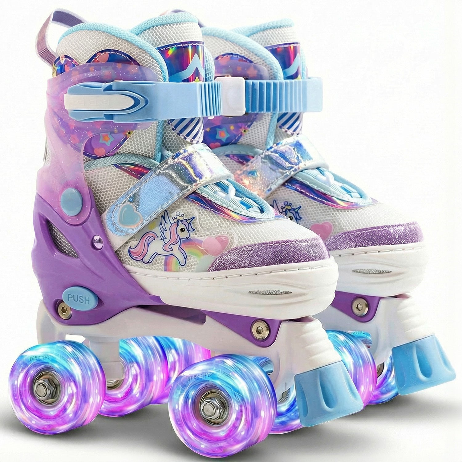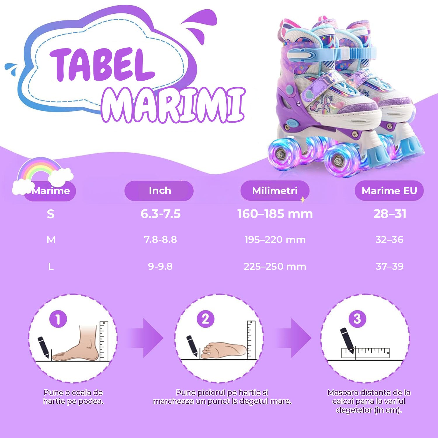 Role Copii Elindor® – Ajustabile, cu Roti Luminoase, Design Unicorn, Sistem de Prindere Sigur, pentru Copii 4–12 Ani, Marime Picior 22.5-25 cm