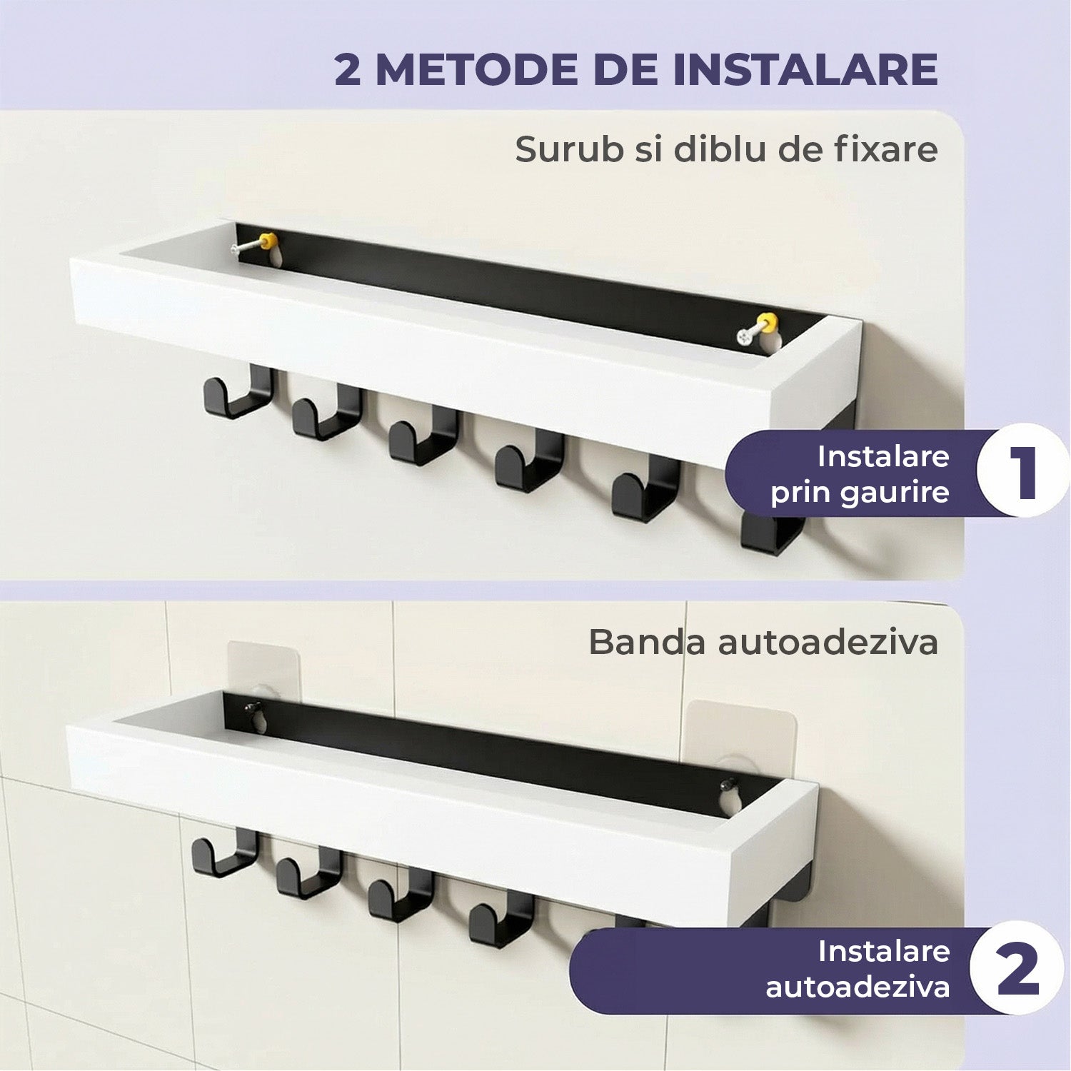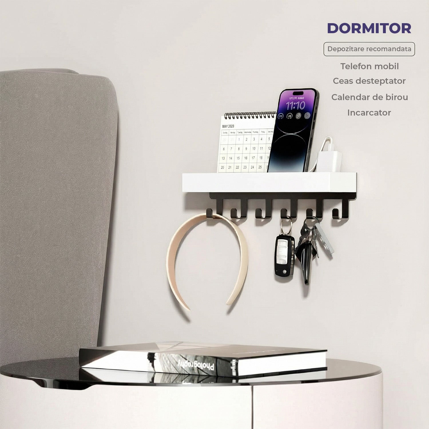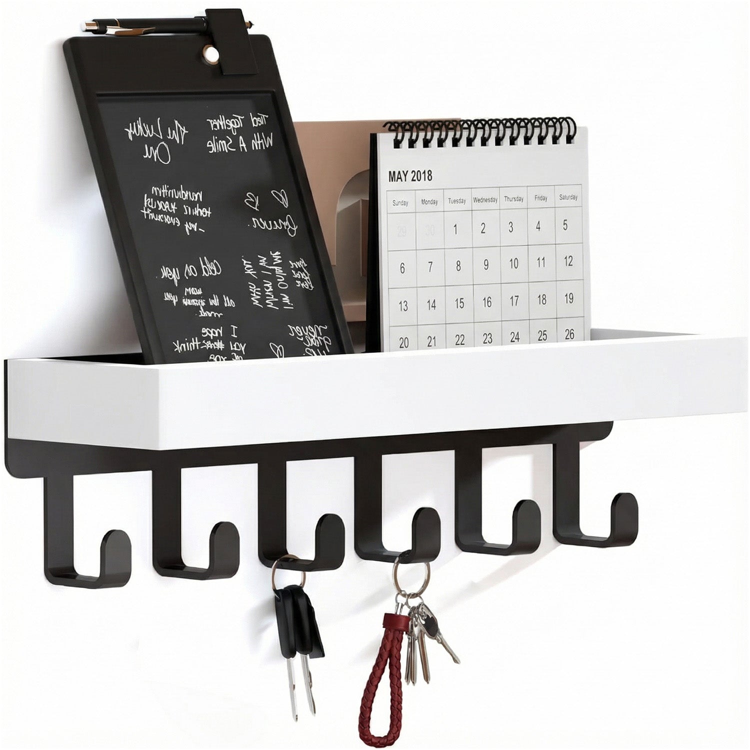 Suport Chei Elindor® – Cu Polita din Lemn si 6 Carlige, Montaj Perete, Organizator Multifunctional pentru Hol, Bucatarie si Dormitor, Alb (25 × 6 × 6 cm)