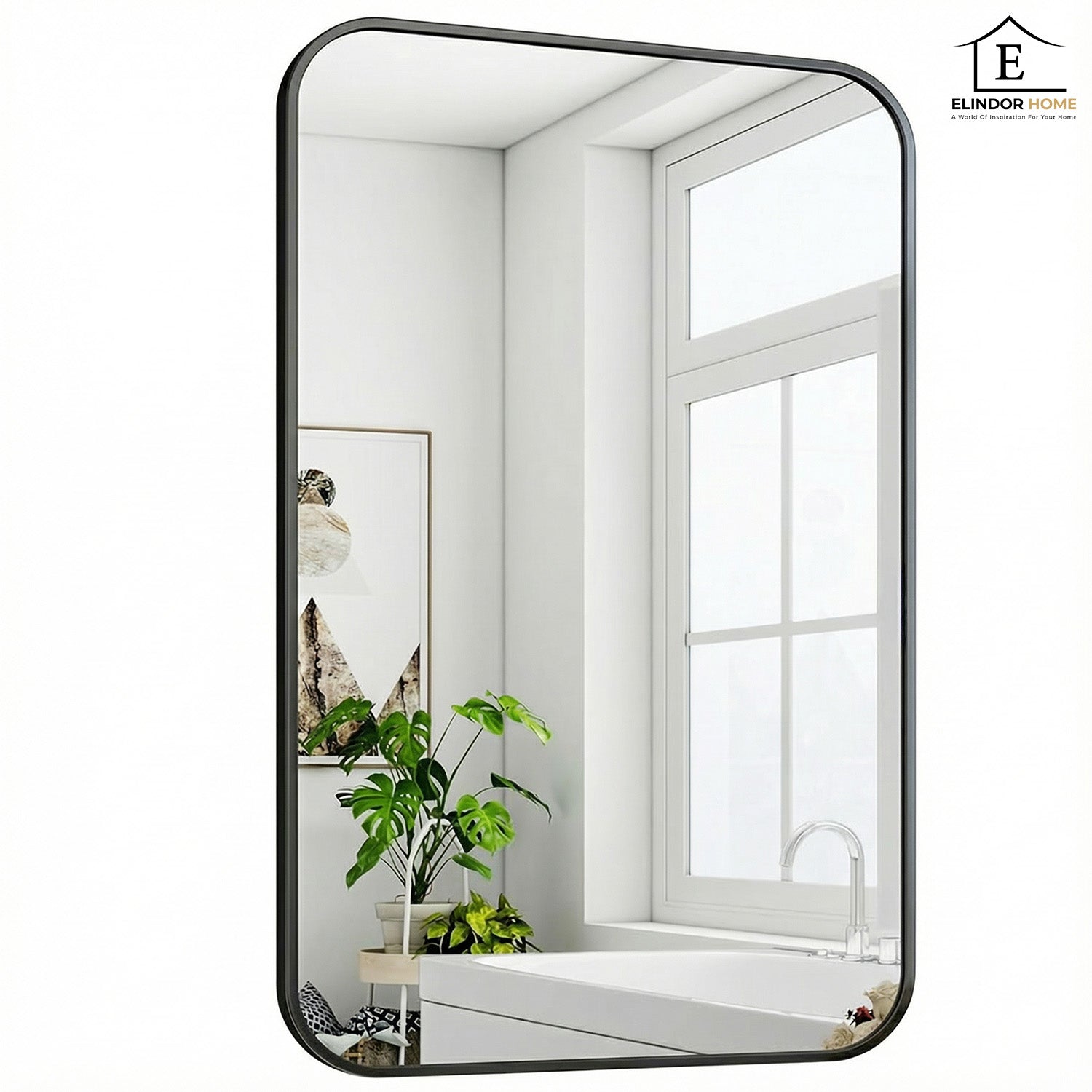 Oglinda de Perete Elindor® – Dreptunghiulara cu Colturi Rotunjite, Rama Metalica Neagra Mat, Montaj Vertical sau Orizontal, 90 × 60 cm, Stil Modern Industrial, Pentru Baie, Dormitor sau Living