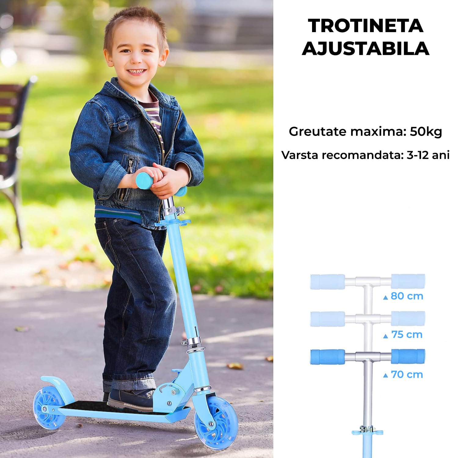 • Ghidon reglabil pe înălțime: Trotineta crește împreună cu copilul tău! Reglabilă în 3 poziții (70 cm, 75 cm și 80 cm), oferă o potrivire perfectă pentru copii între 3 și 12 ani, susținând până la 50 kg.