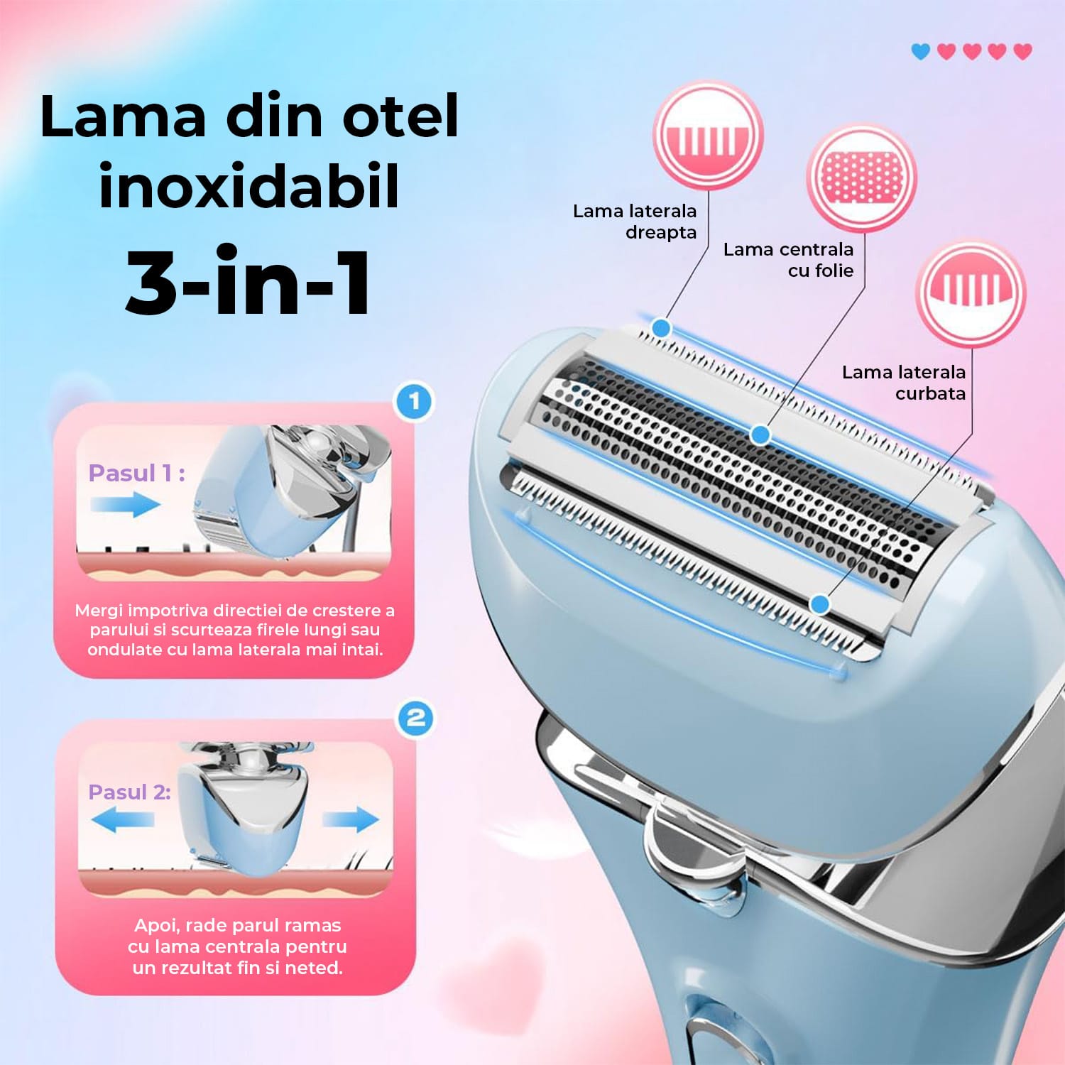 Aparat de Ras Electric Elindor® pentru Femei, 3-In-1, USB Reincarcabil, Ras Uscat/Umed, Albastru