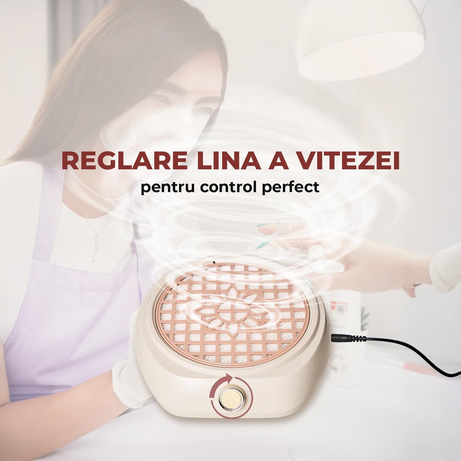 • Control fin al vitezei – reglaj continuu al puterii de aspirare, adaptabil la orice tip de serviciu: pilire, curățare, îndepărtare gel/acryl