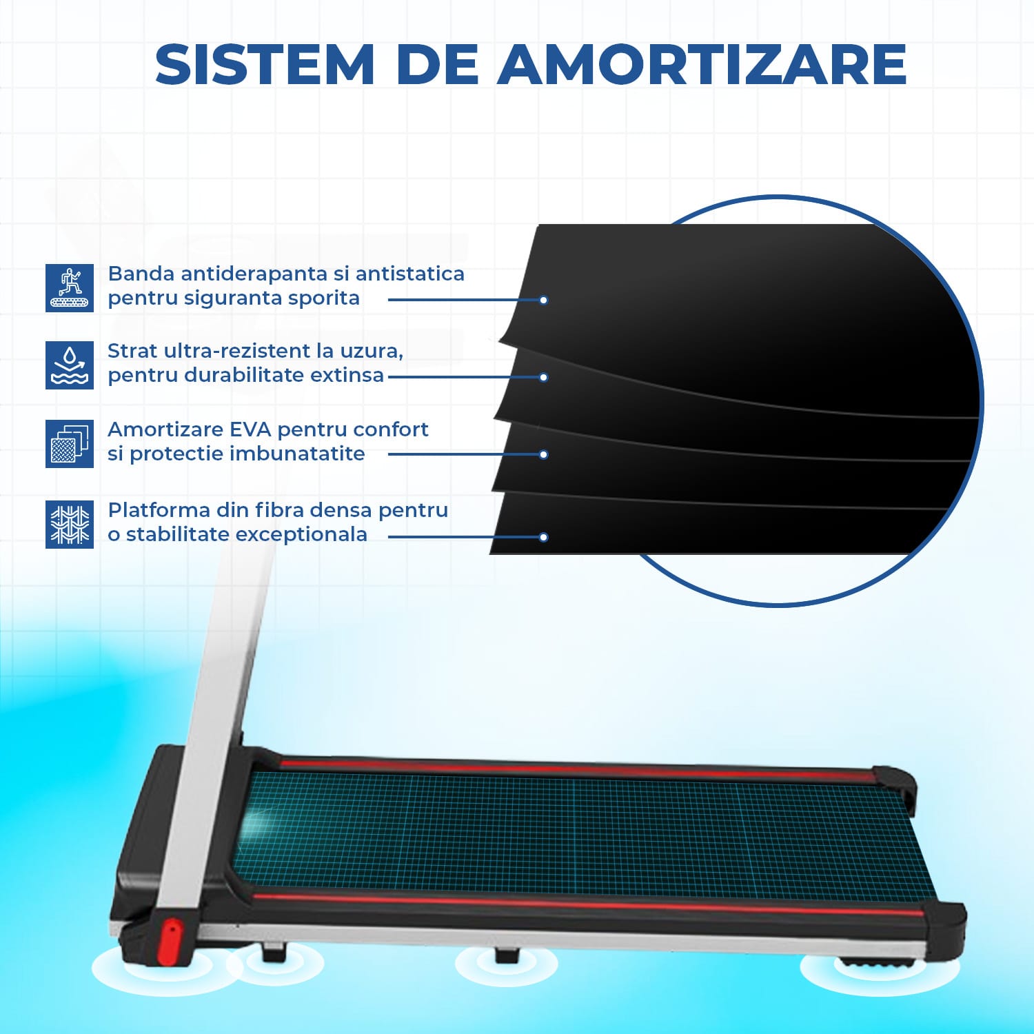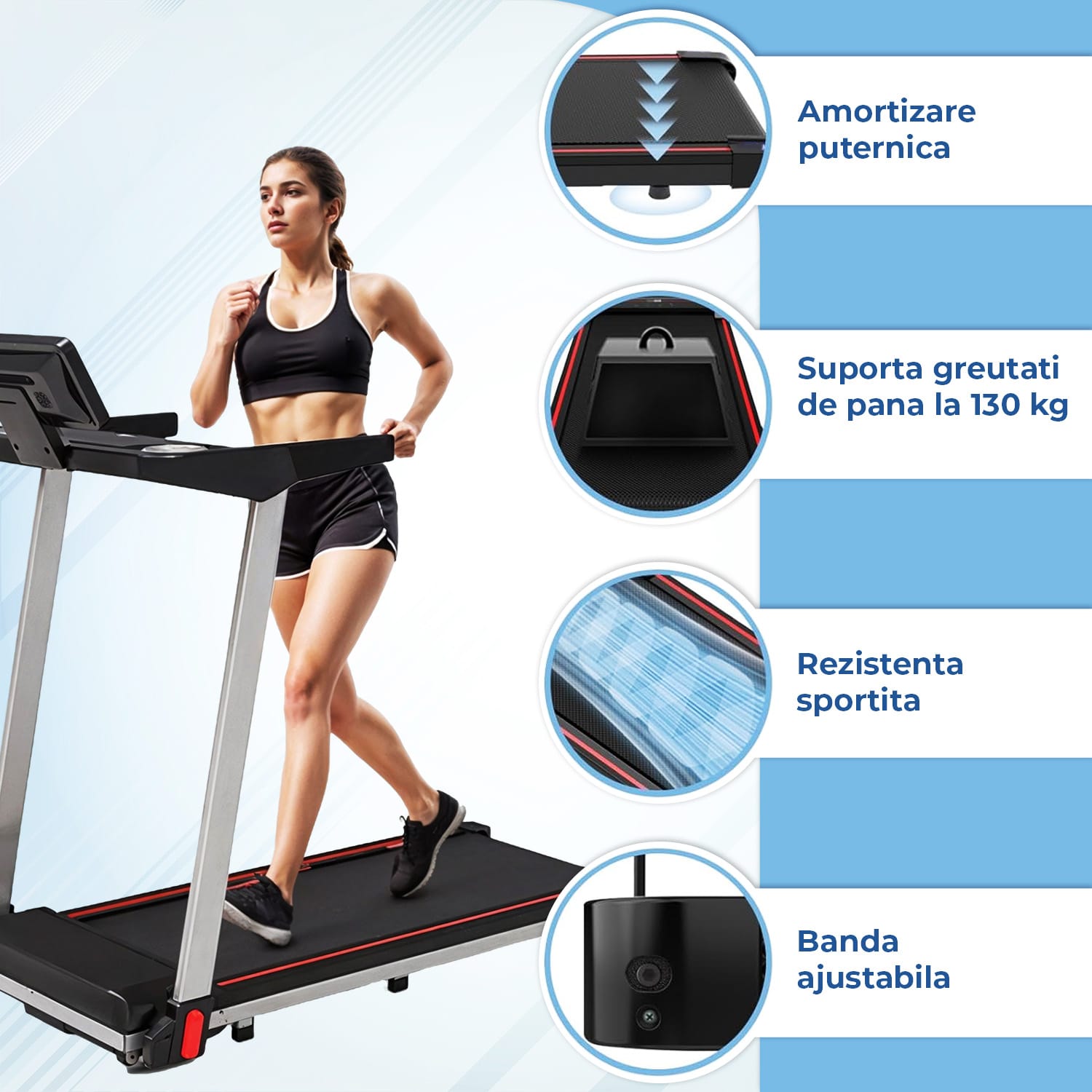 Suprafață de Alergare Sigură: Banda de alergare dispune de o suprafață aderentă (400x1070 mm), asigurând stabilitate optimă în timpul exercițiilor.