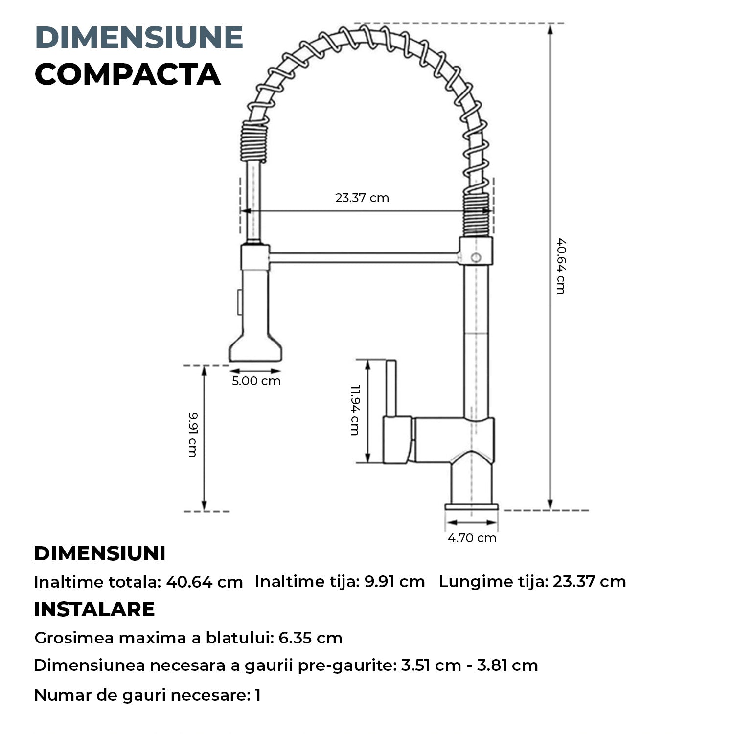 Mobilitate și funcționalitate avansată – Gâtul robinetului se rotește 360°, oferind acces facil la întreaga chiuvetă. Mecanismul cu bilă gravitațională asigură revenirea automată a dușului extractibil după utilizare, pentru o experiență mai comodă.