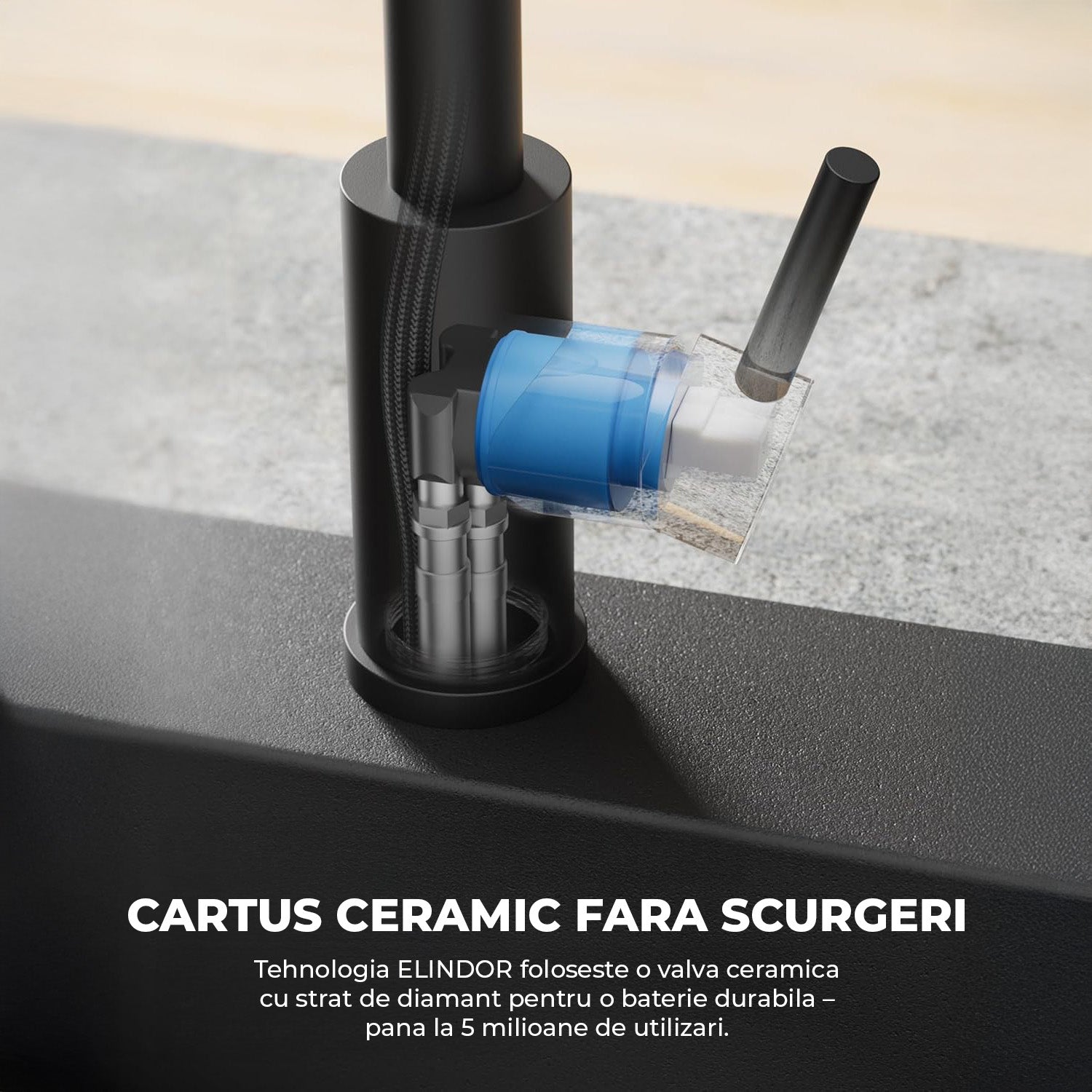 Materiale premium și siguranță – Fabricată din oțel inoxidabil 304, bateria oferă o rezistență ridicată la coroziune și o etanșare superioară, reducând riscul de scurgeri. Cartușul ceramic rezistent a fost testat pentru 500.000 de cicluri de utilizare, garantând un flux de apă constant și stabil.