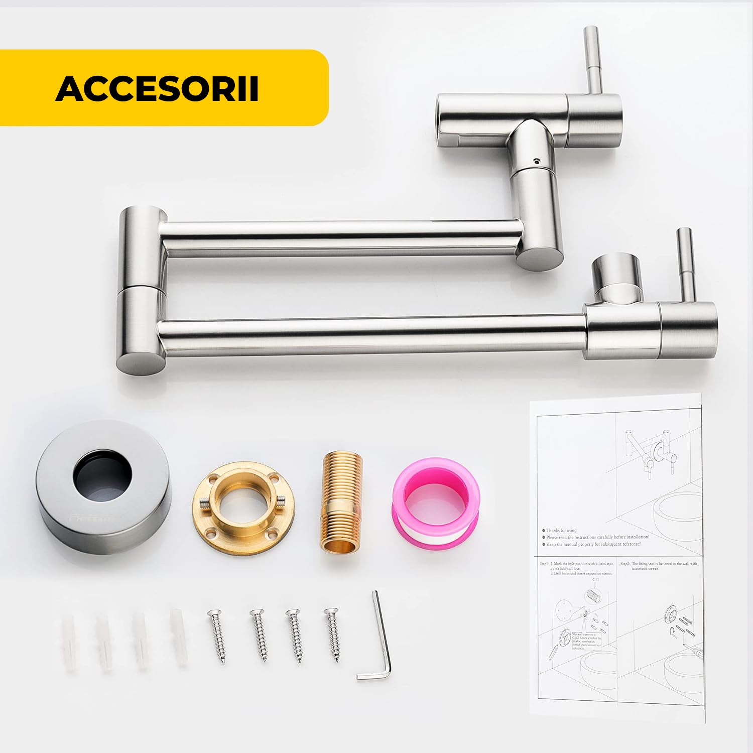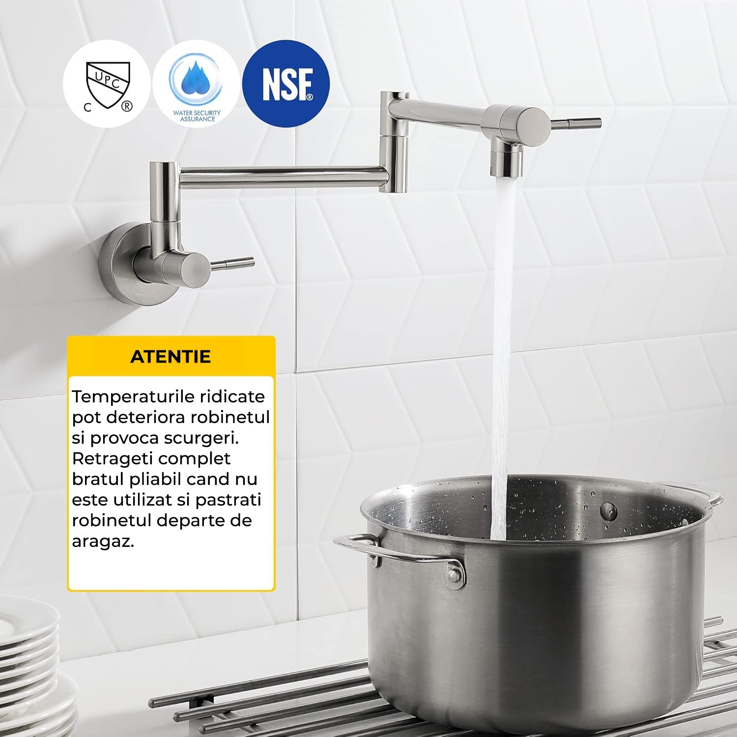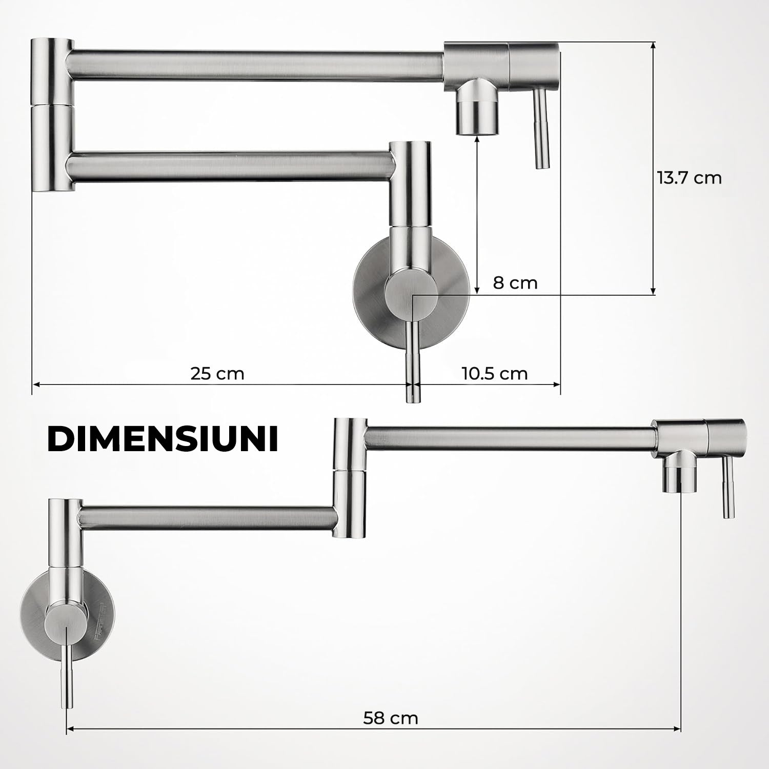 Ideală pentru bucătăriile moderne și funcționale, Bateria Bucatarie Elindor® aduce un plus de eleganță și performanță, oferindu-vă o soluție durabilă și eficientă pentru umplerea rapidă a oalelor mari și pentru activitățile zilnice din bucătărie.