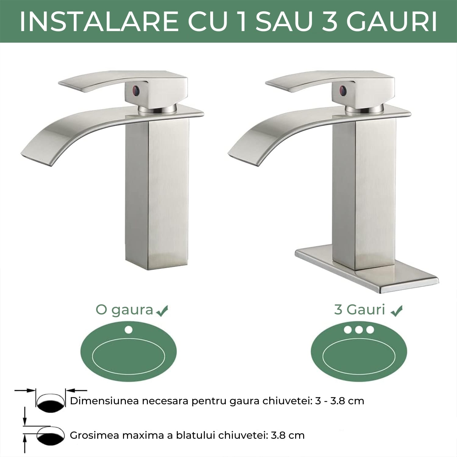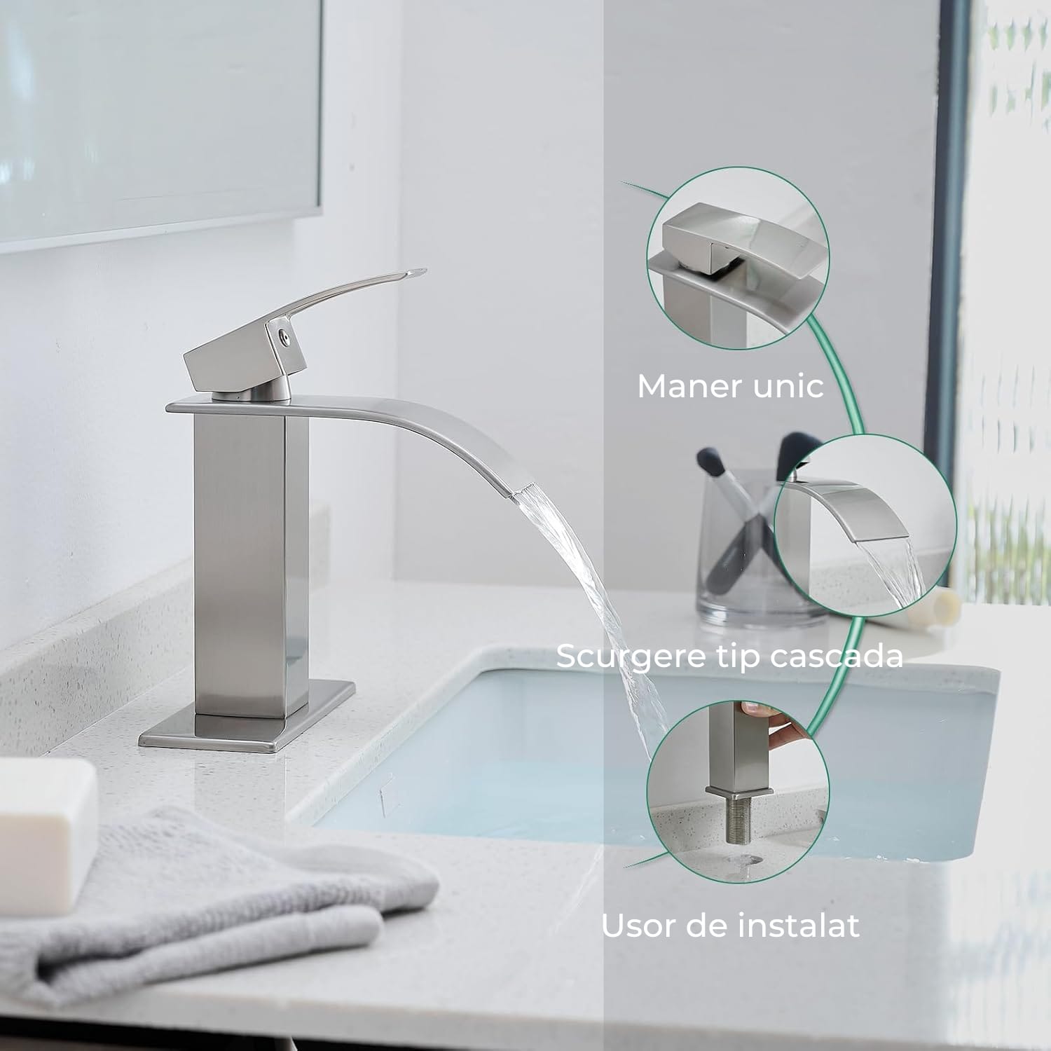 Baterie Cascadă Elindor® pentru Chiuveta Baie, Finisaj Nichel Satinat, Mâner Unic, Placă pentru 1 sau 3 Găuri