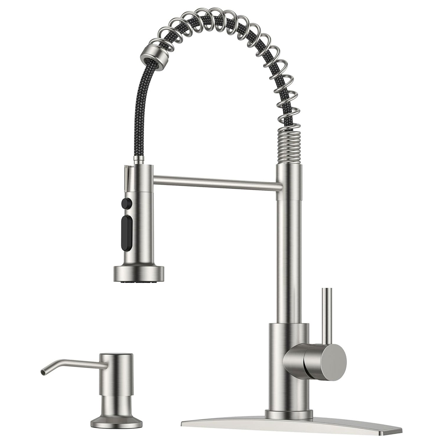 Include baterie de bucătărie și dozator compact de săpun, cu țeavă de admisie 1/2 inch, cu pompă rotativă 360° și rezervor de 350 ml, reîncărcabil de sus.