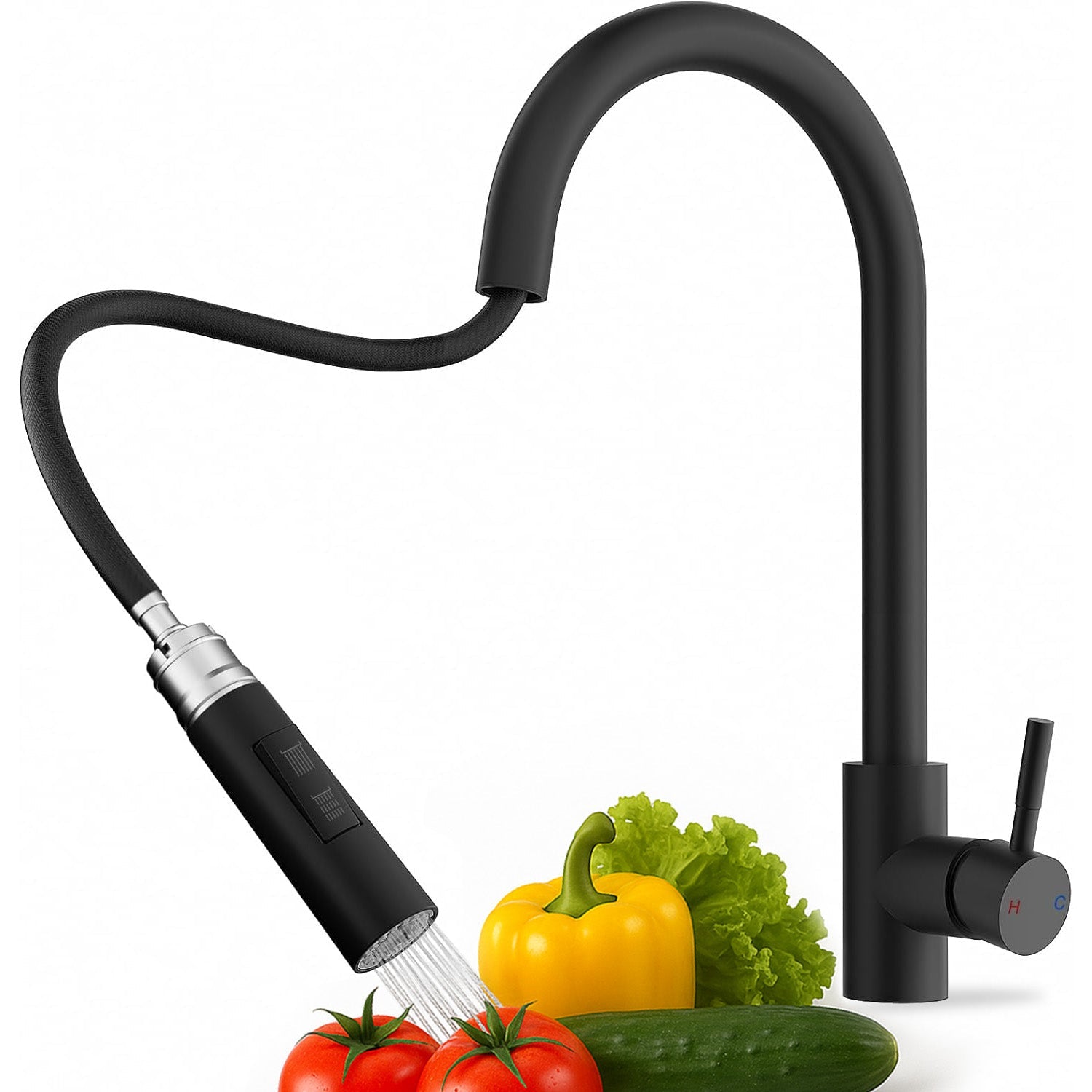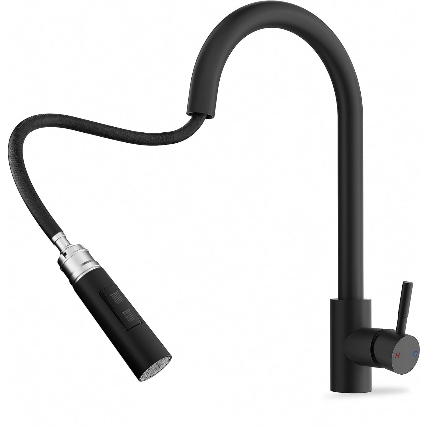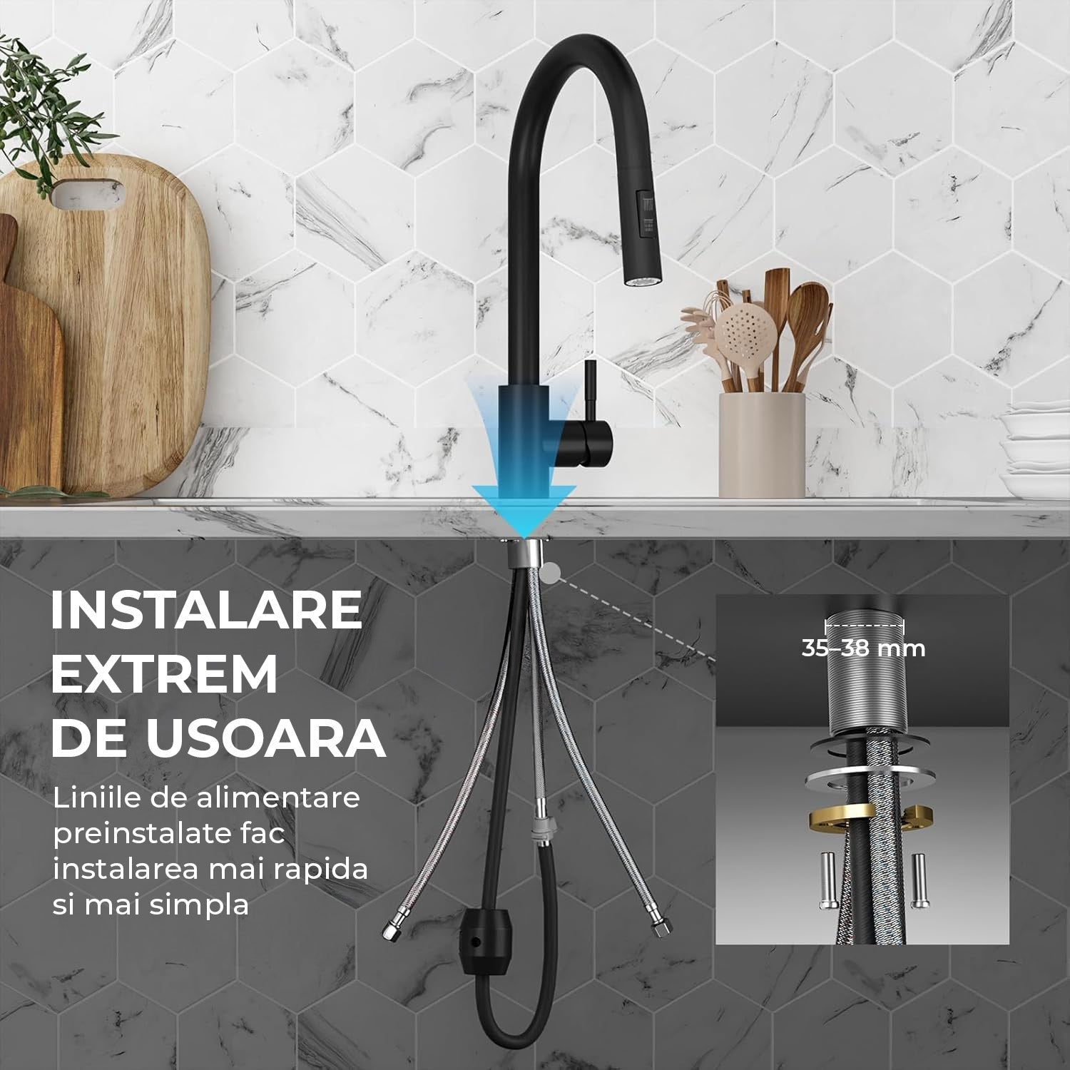 Baterie Chiuveta Neagra Elindor®, Robinet de Apa pentru Bucatarie, Jet Reglabil, Modern cu Pipa Flexibila, Cap Dus Extractabil cu Doua Functii, Monocomanda, Rotativ 360°, Otel Inoxidabil, Finisaj Mat