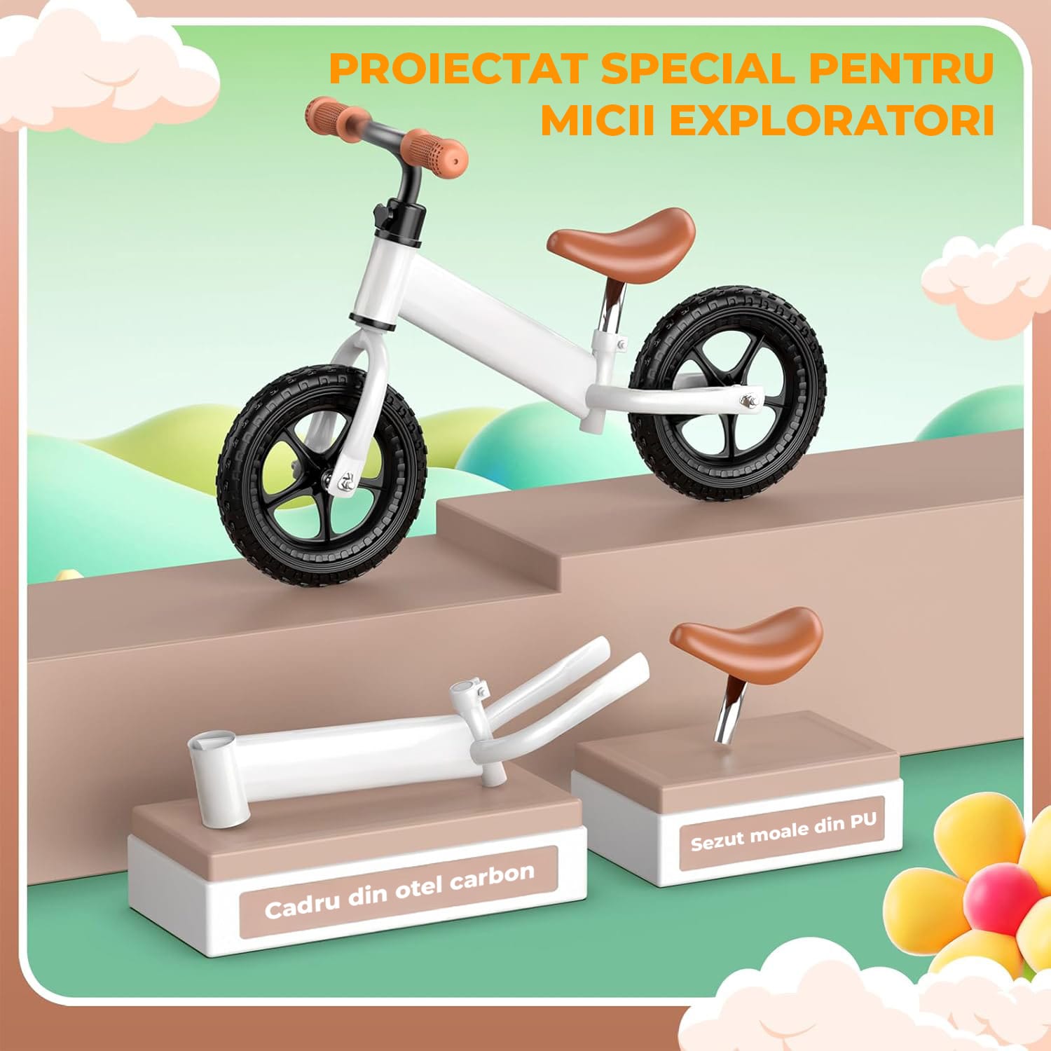 Bicicleta Fara Pedale Elindor®, Scaun Reglabil si Confortabil, Usoara, Alb