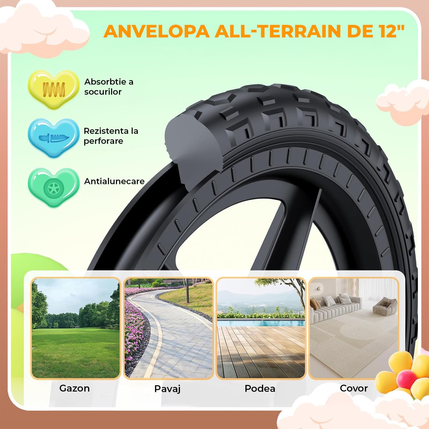 Anvelope EVA Rezistente: Roti EVA de 12 inch asigură o aderență excelentă, rezistență la perforare și absorbție a șocurilor, fiind ideale pentru diverse suprafețe, precum gazon, pavaj, podea sau covor.