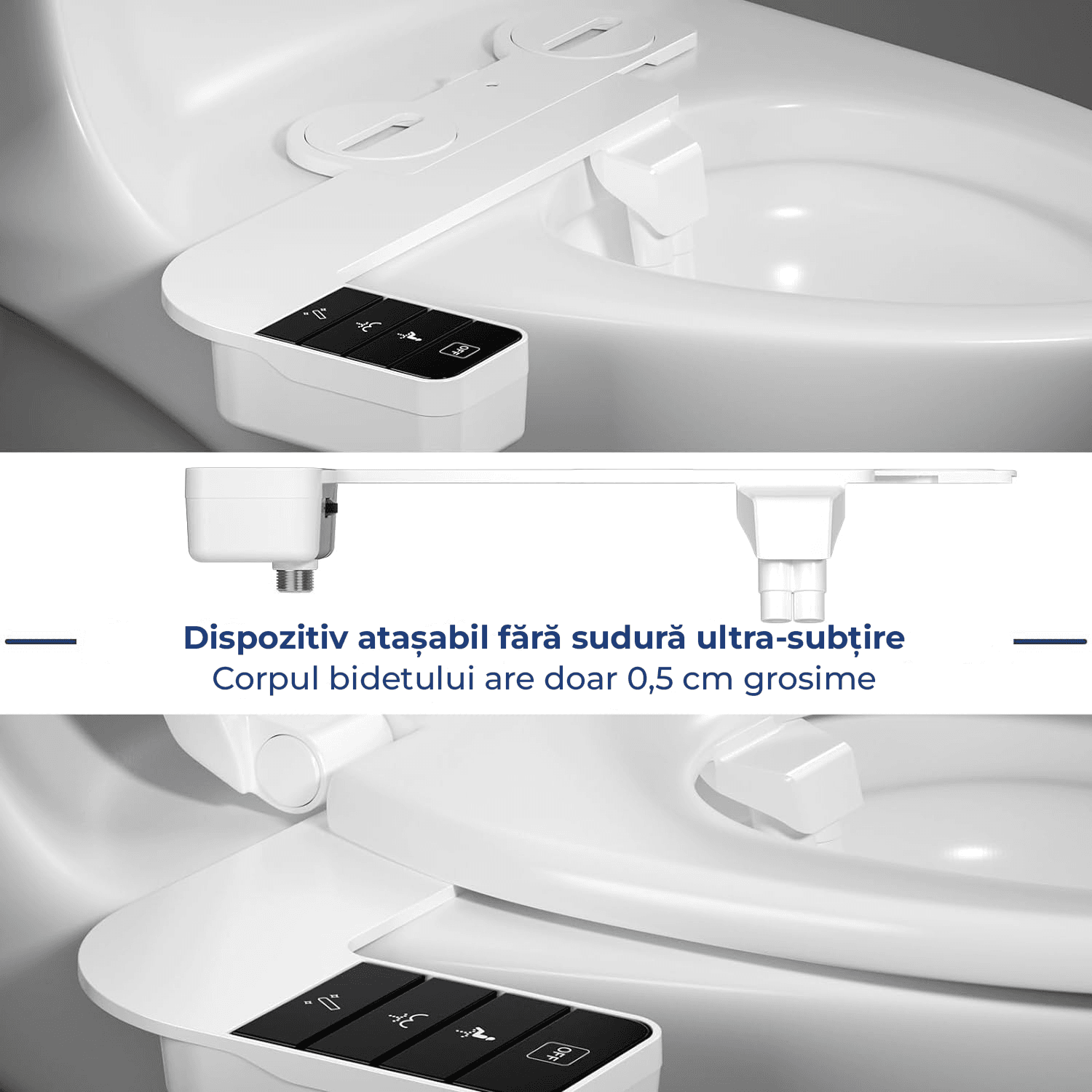Protectie pentru igiena: Duza retractabila se retrage automat in spatele protectiei dupa utilizare. Functia de auto-curatare curata in mod eficient duza, asigurand o protectie maxima si intretinere usoara, oferindu-ti o igiena dubla garantata. Bidetul ergonomic are doar 0,5 cm grosime, este compatibil cu majoritatea capacelor de toaleta.