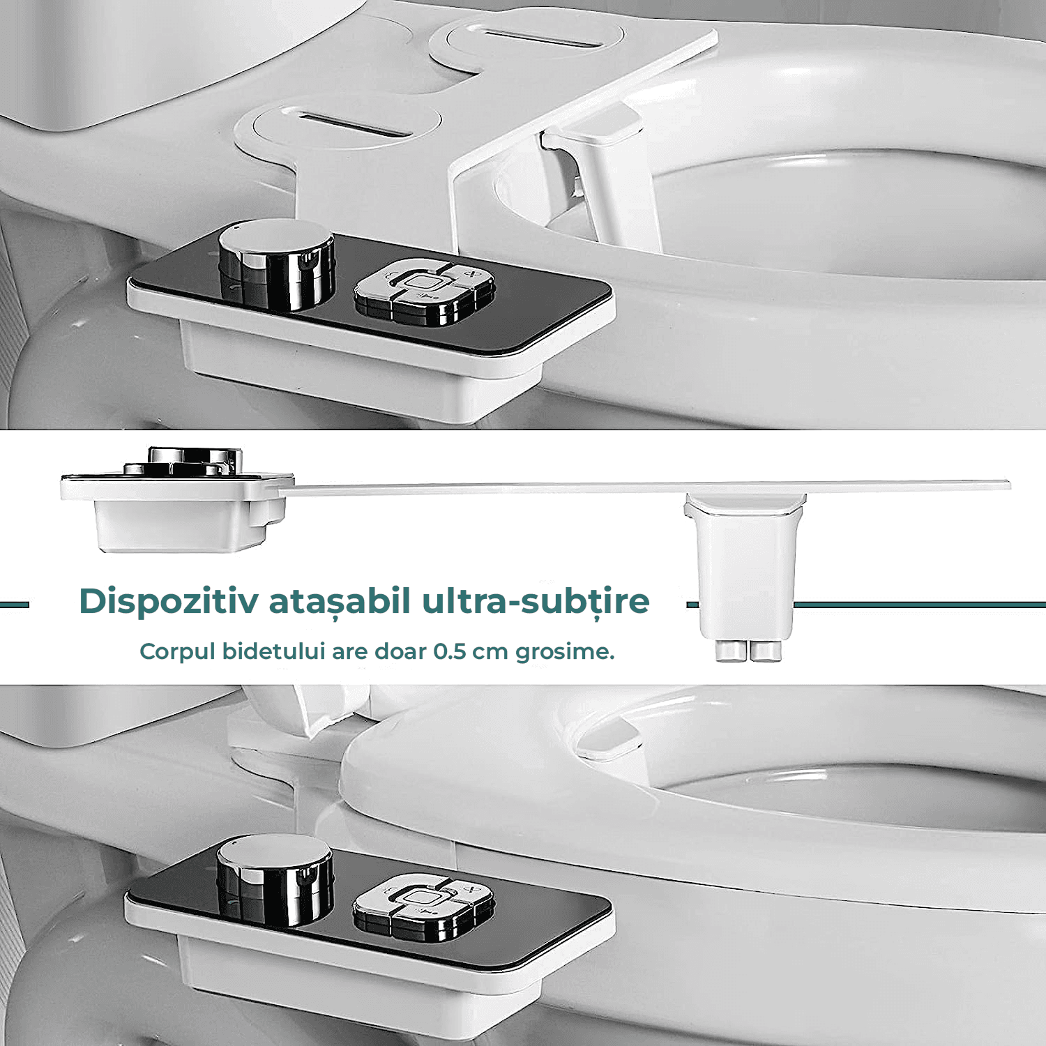 Protectie pentru igiena: Duza retractabila se retrage automat in spatele protectiei dupa utilizare. Functia de auto-curatare curata in mod eficient duza, asigurand o protectie maxima si intretinere usoara, oferindu-ti o igiena dubla garantata. Bidetul ergonomic are doar 0,5 cm grosime, este compatibil cu majoritatea capacelor de toaleta.