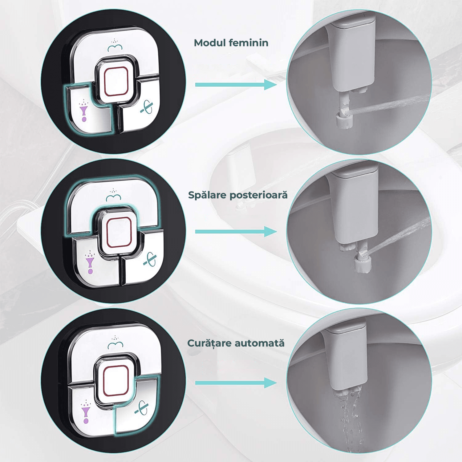 Doua duze pentru spalare: Bidetul non-electric are doua duze cu doua moduri de pulverizare: curatare posterioara pentru si curatare frontala pentru zonele intime ale femeilor. Designul cu buton este mai convenabil pentru utilizare. Design cu buton pentru o comutare mai usoara intre moduri.