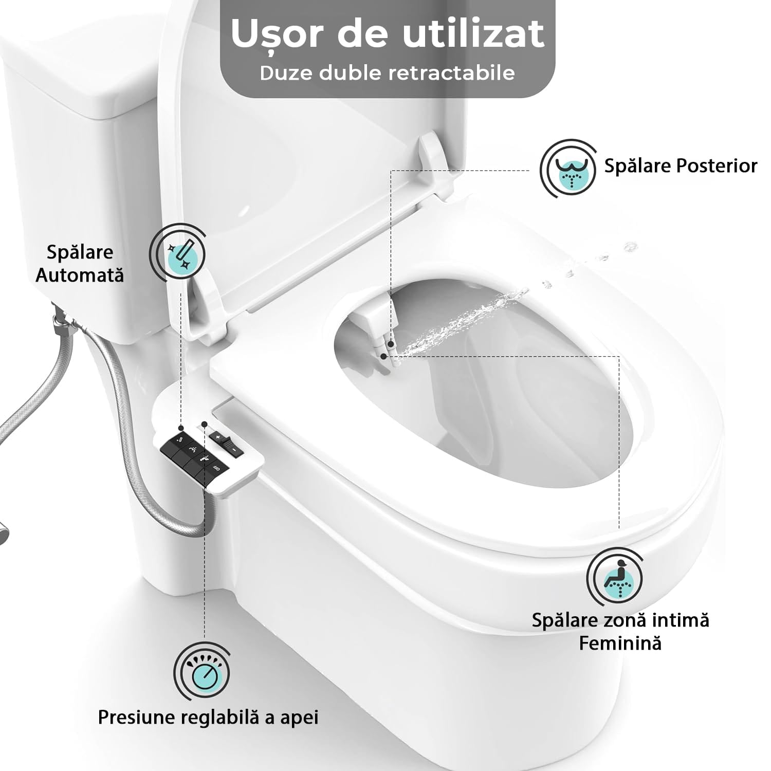 Igienă Premium: Cu duzele duale retractabile si controlul precis al presiunii apei, acest bideu pentru toaleta asigura o curatare cuprinzatoare pentru o experienta mai sigura si mai igienica. Spune adio bacteriilor, mirosurilor si impuritatilor!