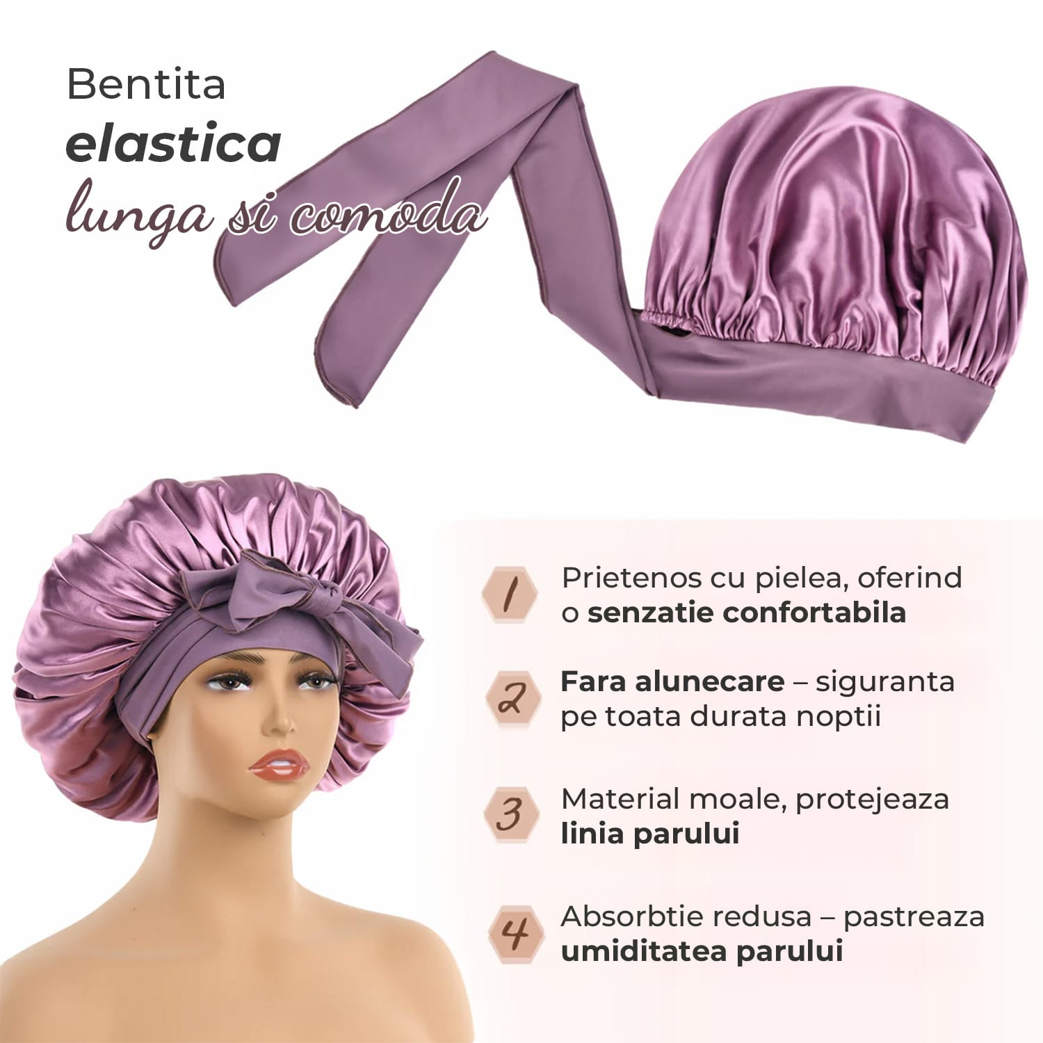 Protejează părul de frecare și rupere – Satinul moale și delicat păstrează umiditatea naturală a părului, prevenind uscarea și deteriorarea.