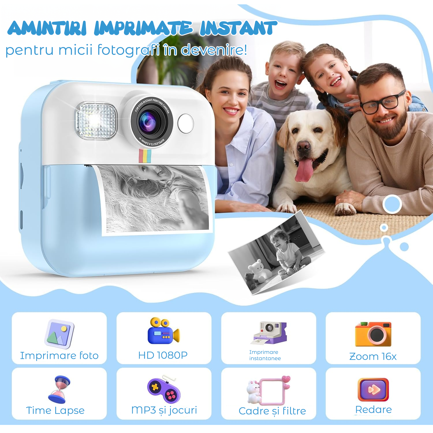 Camera Foto Instant Elindor® Pentru Copii, 1080P HD, Functie Printare Fara Cerneala, 3 Role Hartie Incluse, 32GB SD, Albastru
