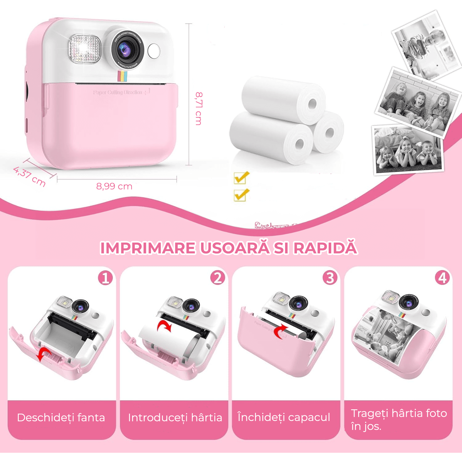 Camera Foto Instant Elindor® Pentru Copii, 1080P HD, Functie Printare Fara Cerneala, 3 Role Hartie Incluse, 32GB SD, Roz
