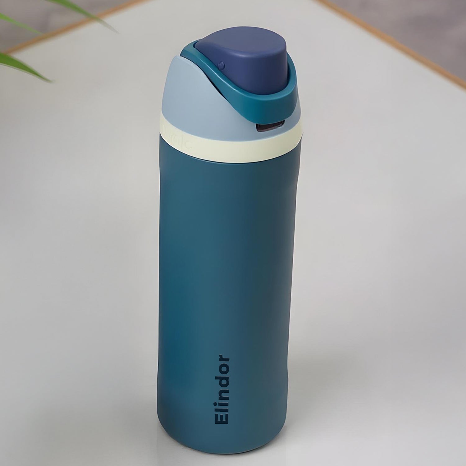Cana Termos cu Gura Dubla Elindor® din Otel Inoxidabil, Izolatie cu Pereti Dubli, Deschidere Capac prin Apasare de Buton, Capacitate 710 ml, Rezistenta la Scurgeri, fara BPA, Ideala pentru Apa, Ceai, Cafea sau Smoothie, Albastru Verzui