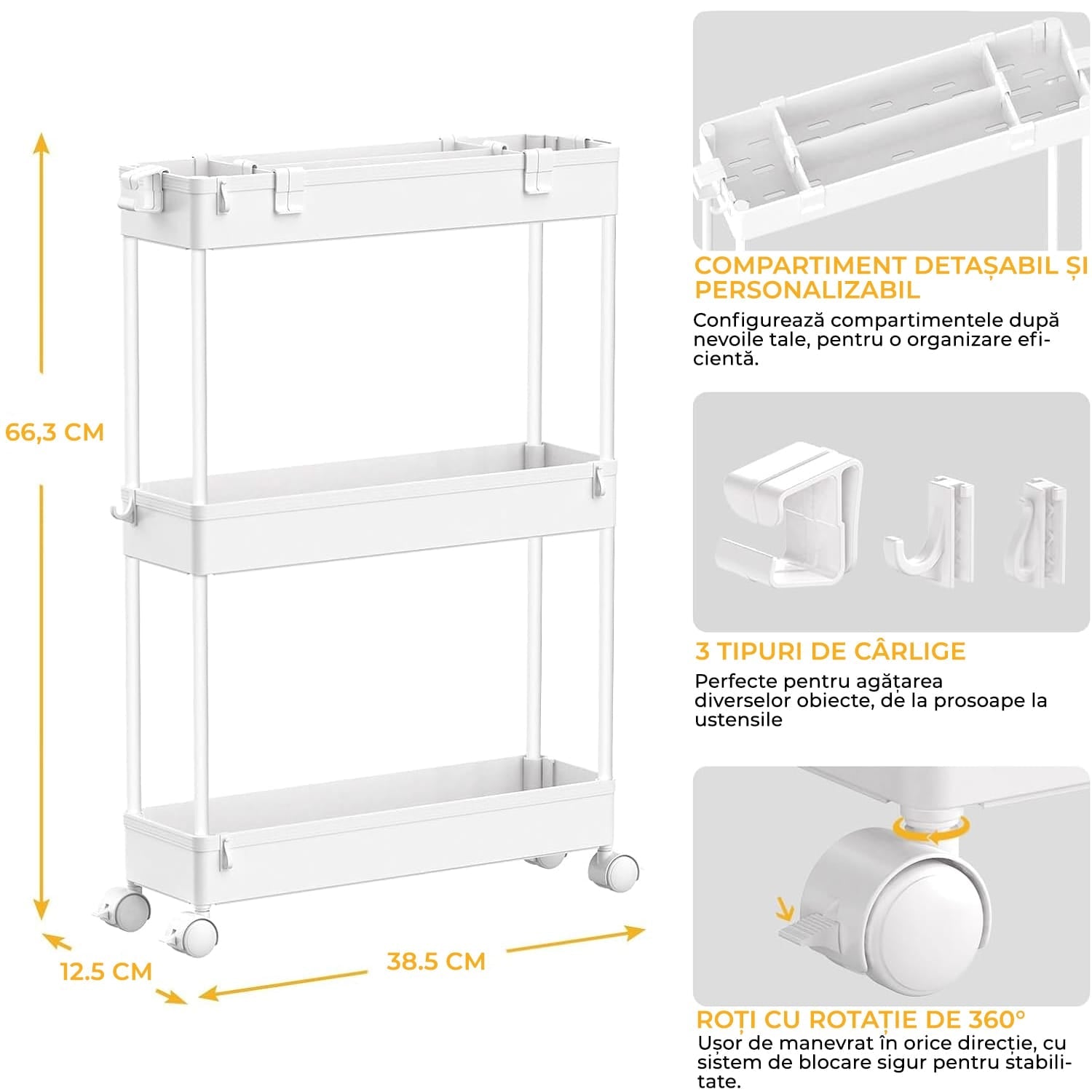 Spațiu de Depozitare Generos: Căruciorul de depozitare oferă un strat suplimentar de compartimente, ajutându-te să îți organizezi eficient spațiul și să ai acces rapid la toate articolele necesare. Includem și cârlige laterale care îți oferă mai mult spațiu extern de depozitare, pentru a păstra și mai multe lucruri la îndemână.