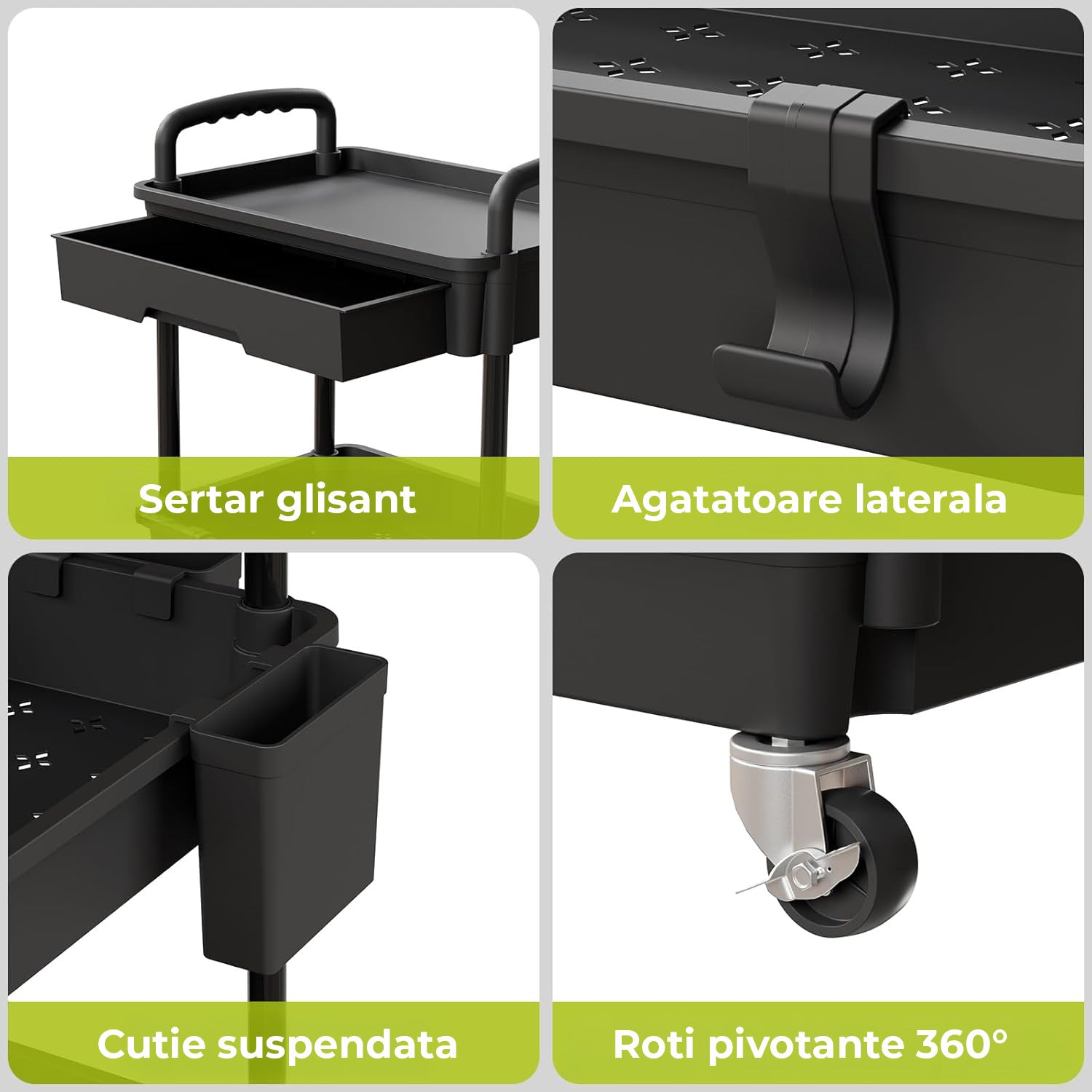 carucior organizator cu roti, raft mobil plastic, organizator baie ingust, carucior bucatarie 3 niveluri, raft depozitare cu sertar, carucior multifunctional negru