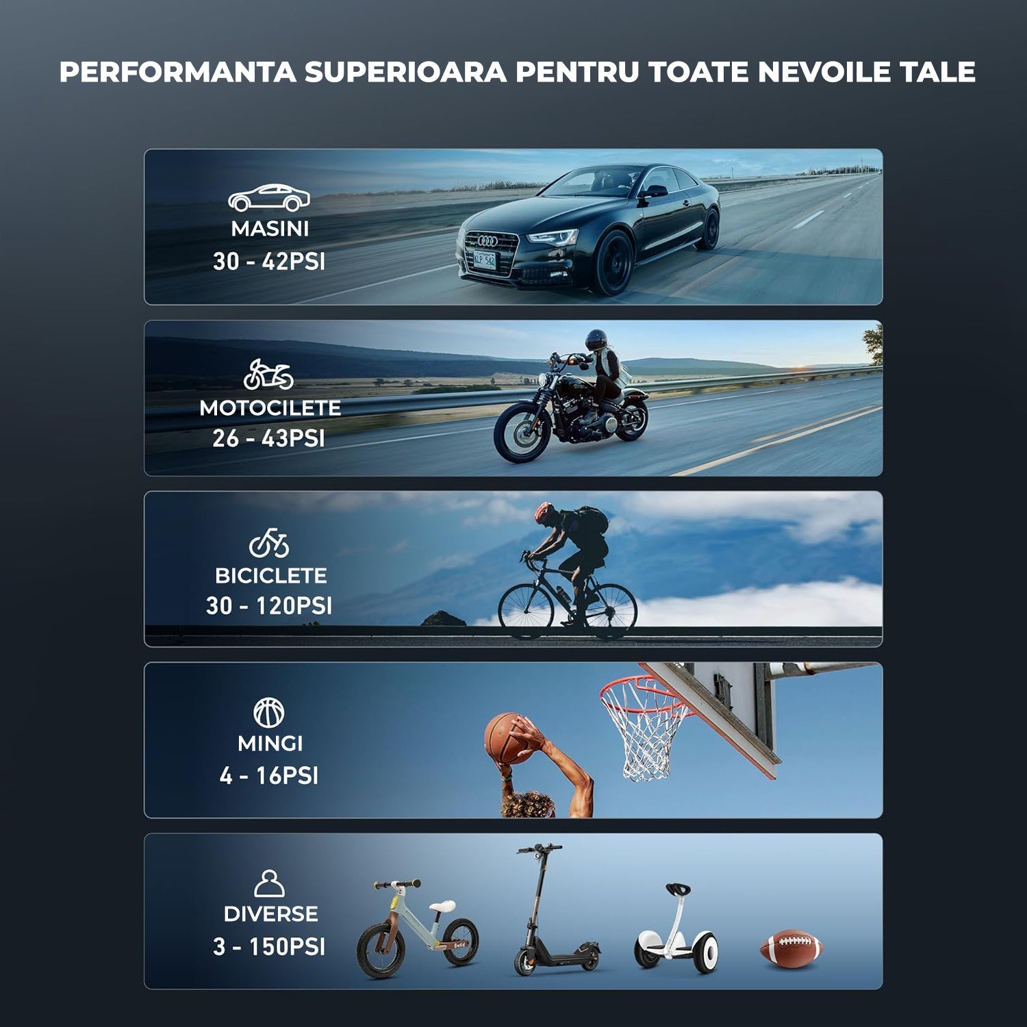 Ușor De Utilizat: Alege din 4+N moduri inteligente (mașină, motocicletă, bicicletă, minge și personalizat) în funcție de nevoile tale de umflare. Poți selecta cu ușurință între 4 unități de presiune (PSI, Bar, kPa, kg/cm²). Modul personalizat îți permite să presetezi liber valoarea dorită a presiunii (3-150PSI) în funcție de obiectele pe care vrei să le umfli.
