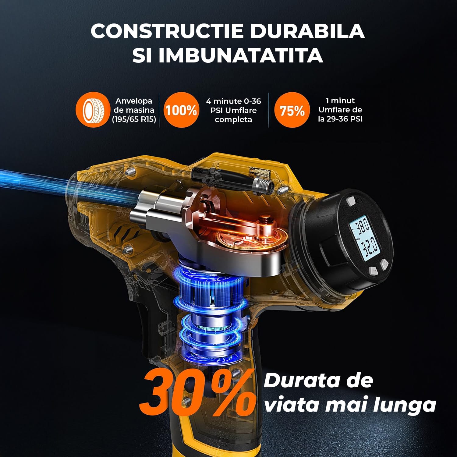 Performanță Excepțională: Motorul metalic și cilindrul îmbunătățit permit funcționarea continuă timp de 20 de minute la capacitate maximă, oferind rezultate rapide și eficiente. În doar 4 minute, anvelopele de dimensiunea 195/65/R15 pot fi complet umflate.