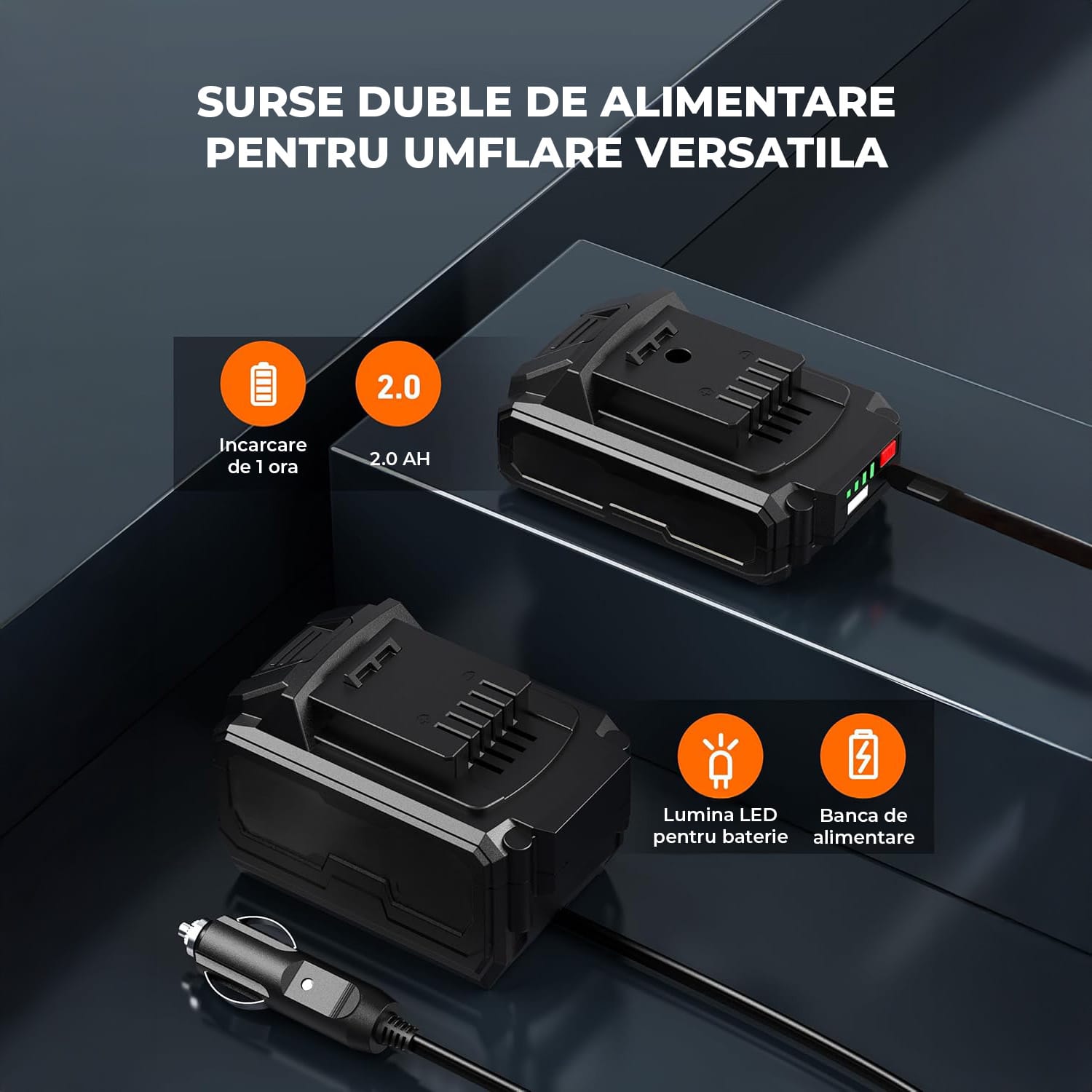 Alimentare Duală: Flexibilitatea este cheia succesului acestui dispozitiv, care poate funcționa atât printr-o baterie 20V reîncărcabilă, cât și printr-o conexiune 12V DC. În plus, bateria se încarcă complet în doar 1 oră, asigurând pregătirea rapidă pentru următoarea utilizare.