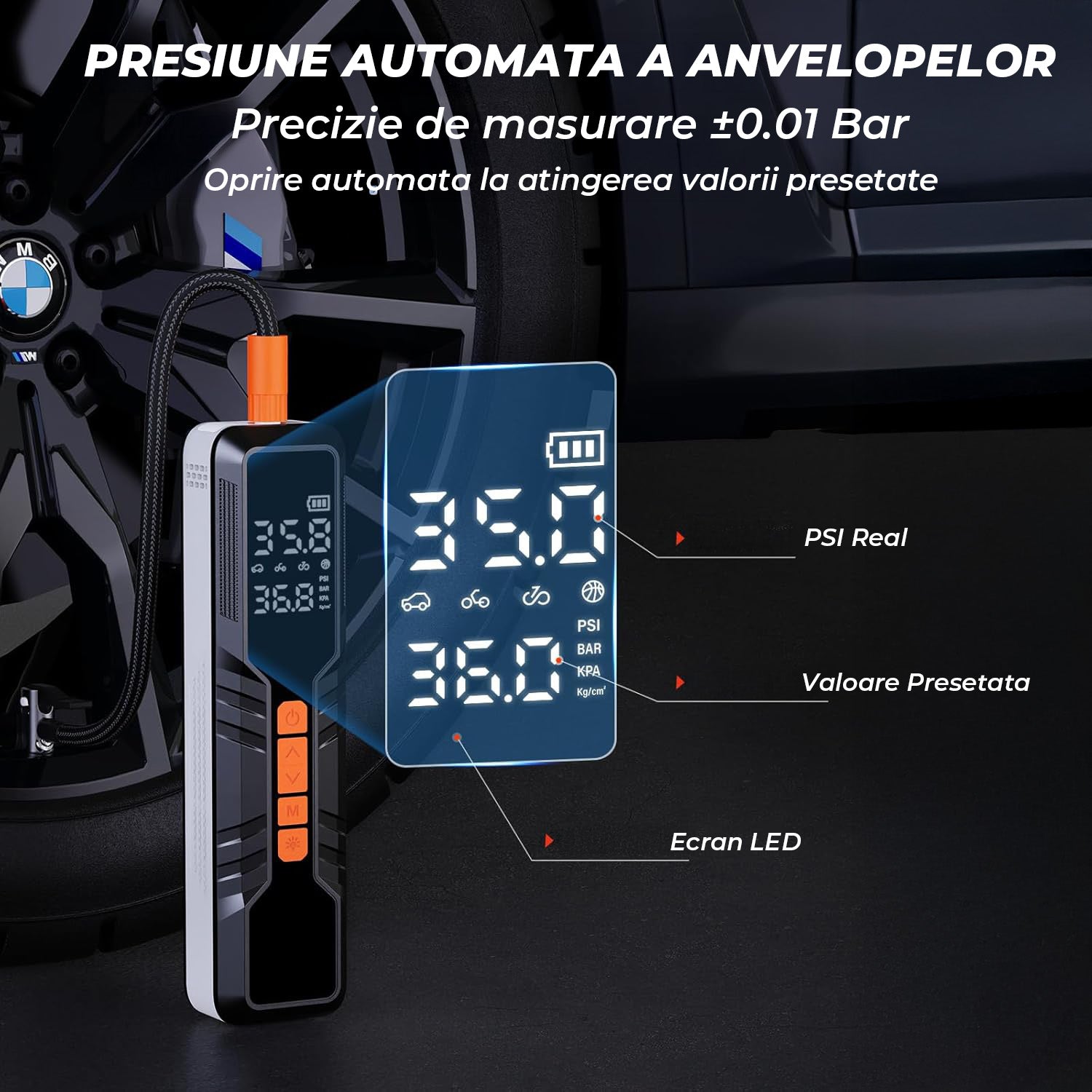 Compresorul portabil de aer asigură o umflare de patru ori mai rapidă datorită motorului puternic de 120.000 rotații pe minut și bateriei de 10.000mAh. Poate umfla anvelopele de la 30 la 36 PSI în doar 22 de secunde și oferă o autonomie de până la 32 de umflări complete la o singură încărcare.