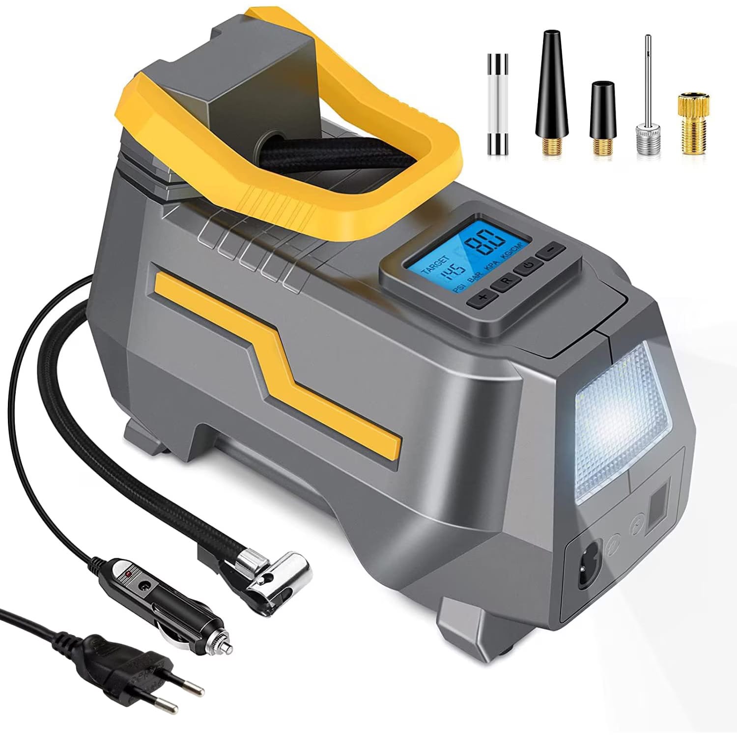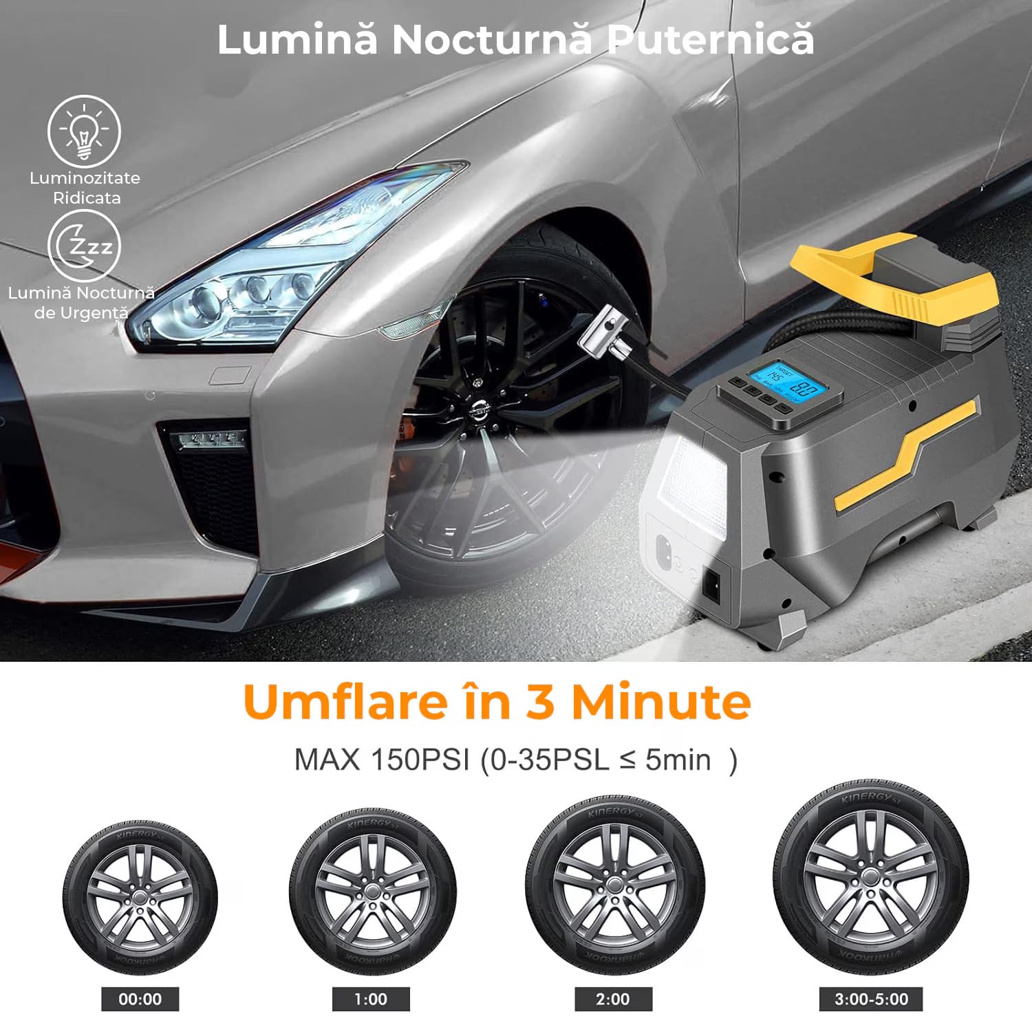 Compresor aer portabil din materiale de înaltă calitate, abs și metal, perfect pentru orice necesitate. Echipat cu o lampă LED puternică, este ideal pentru situații de urgență pe timp de noapte.