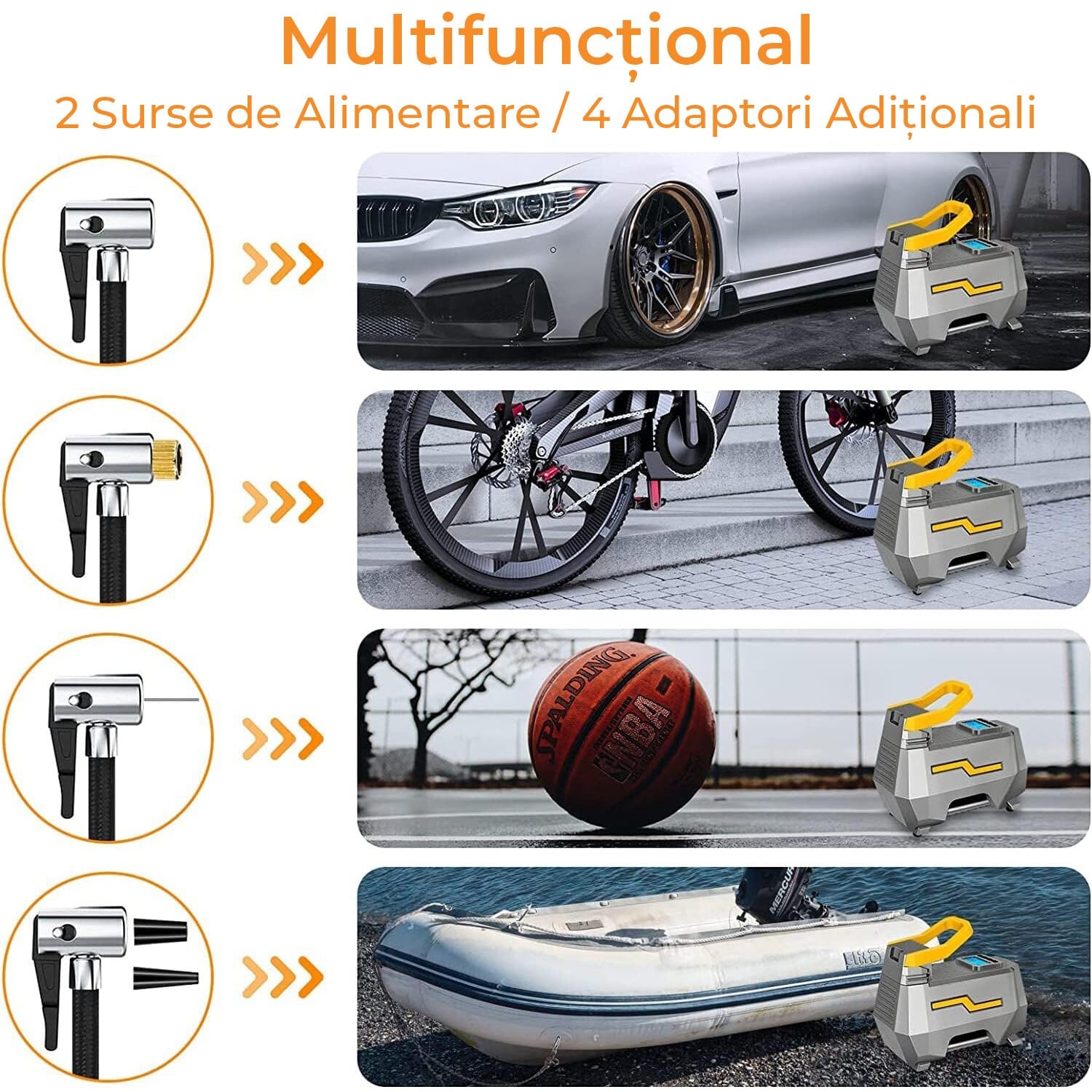 Versatilă și multifuncțională, este compatibilă cu automobile, vehicule off-road, vehicule comerciale, majoritatea motocicletelor, vehicule electrice, bărci gonflabile, mingi, saltele gonflabile și multe altele.