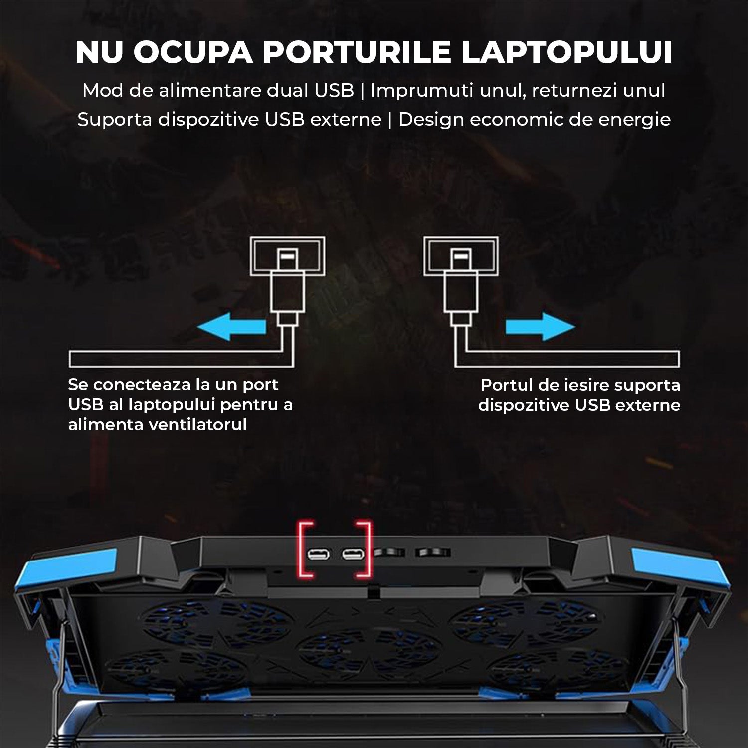 Datorită porturilor USB duble, conectarea devine simplă și eficientă: un port alimentează coolerul, iar celălalt poate fi folosit pentru dispozitive externe. În plus, ai dublă reglare a vitezei pentru un control total asupra răcirii.