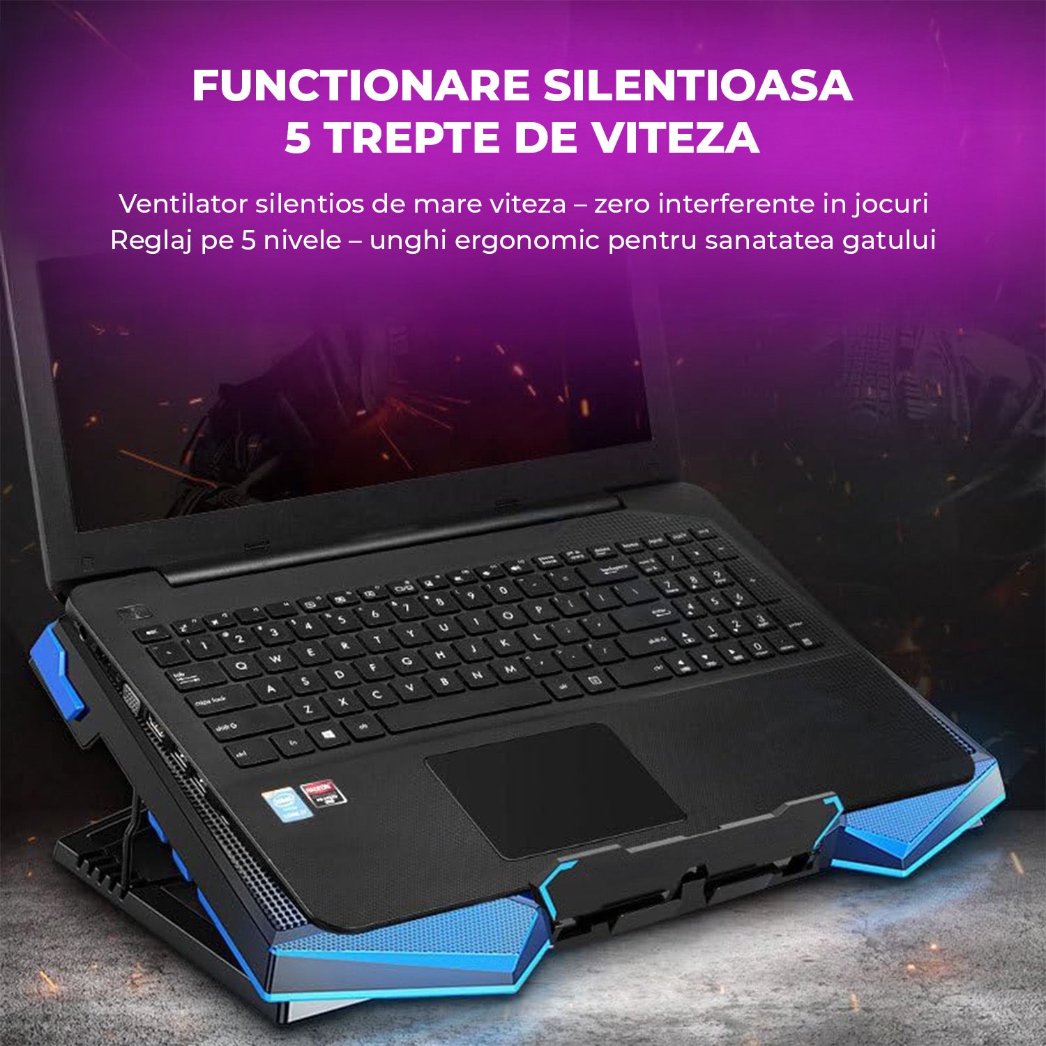 Echipat cu un sistem de 5 ventilatoare de mari dimensiuni (10×10×1.5 cm), acest cooler menține constant fluxul de aer și elimină căldura acumulată. Indiferent dacă te joci titluri solicitante sau rulezi programe de editare, laptopul tău va funcționa la capacitate maximă, fără riscul supraîncălzirii.