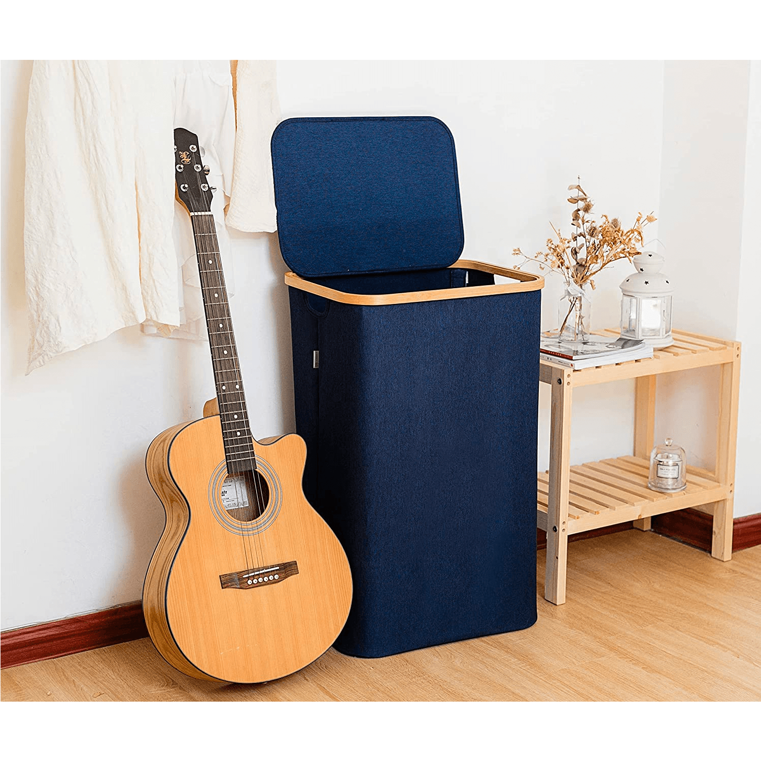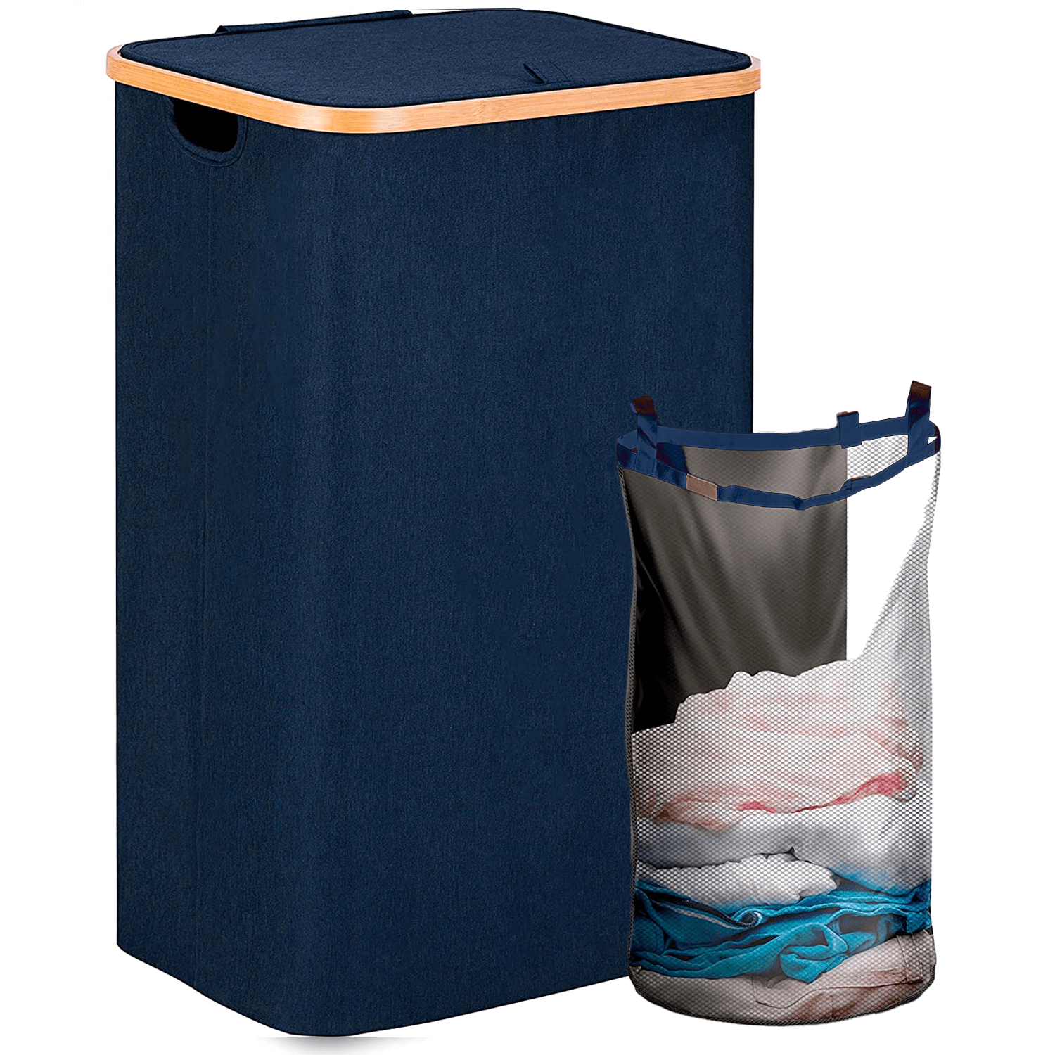 Coș de Rufe Bambus, Pliabil, cu Capac și Sac Detașabil, 100 L, 74 x 41 x 33 cm, Material Textil, Albastru