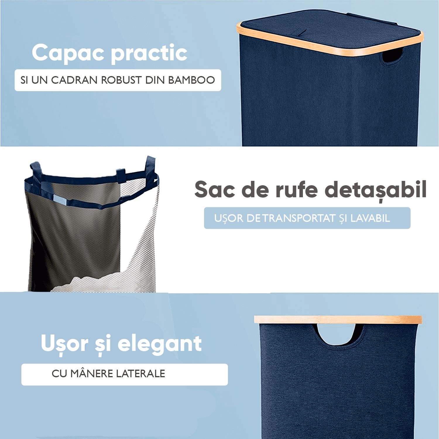 UȘOR DE TRANSPORTAT: Coșul de rufe este fabricat din bambus natural și panză cationică groasă, care ii conferă un aspect elegant. Este foarte ușor și are un maner, astfel incat puteți transporta cu ușurință hainele murdare direct la mașina de spălat.