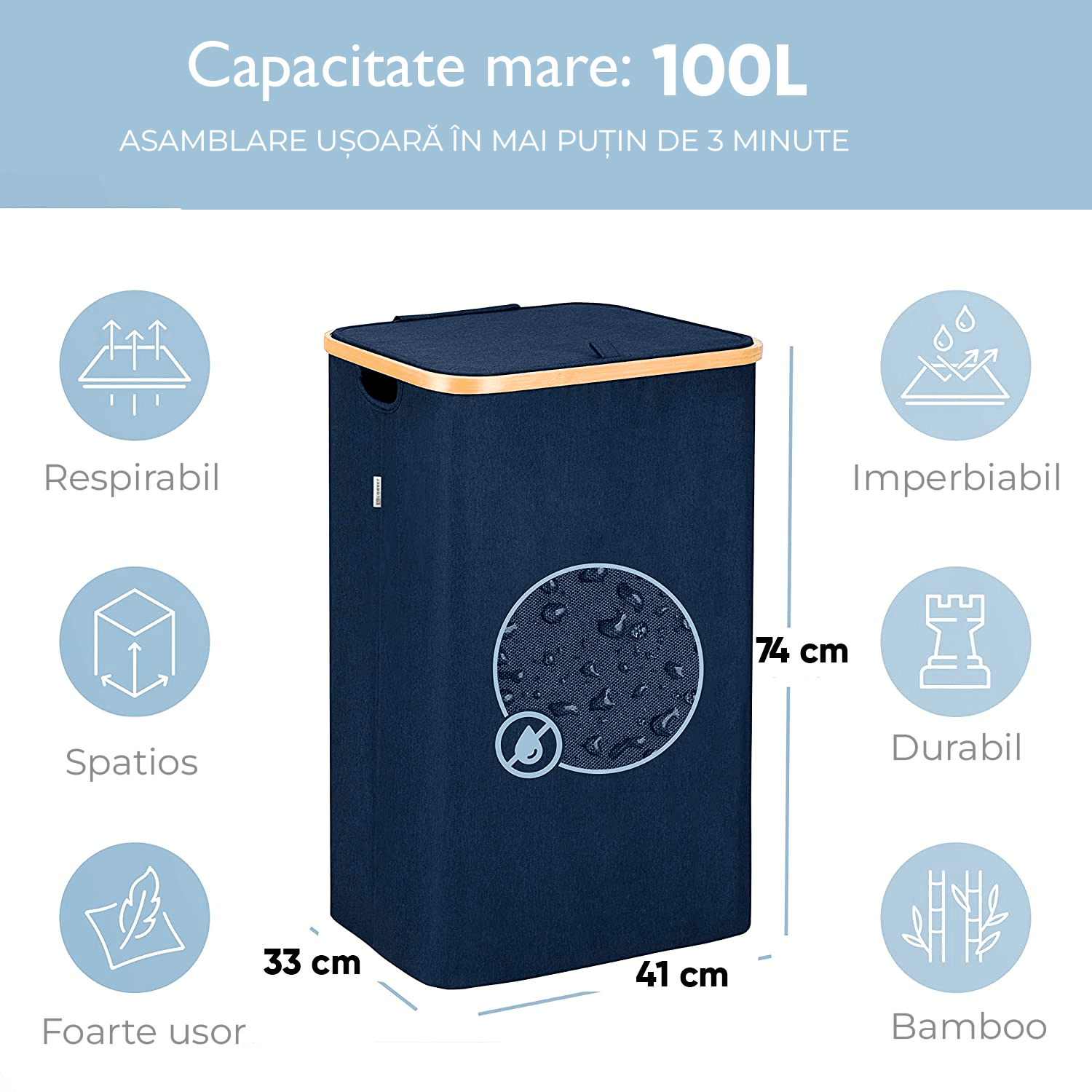 MARE CAPACITATE: Acest coș de rufe pliabil cu capac este robust și durabil, suficient pentru o familie. Are o capacitate de 100 litri și este suficient de mare pentru a colecta hainele pentru o săptămană. Dimensiunile sale sunt de 74 x 41 x 33 cm. In comparație cu alte coșuri de rufe, acesta este foarte puternic, stabil și cu o capacitate mare, fără să se prăbușească enervant.