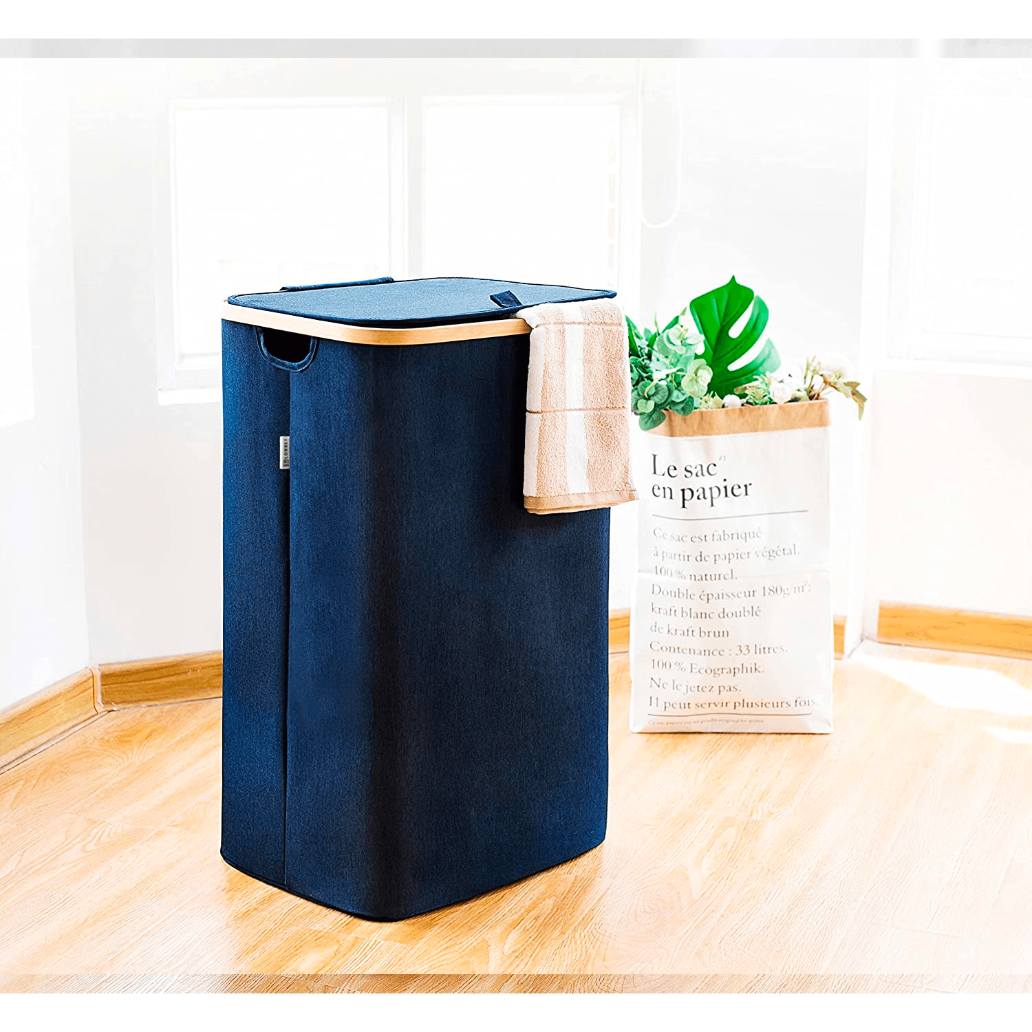Cos de rufe bambus, pliabil, cu capac si sac de rufe detasabil, 100 L, 74 x 41 x 33 cm, material textil, Albastru