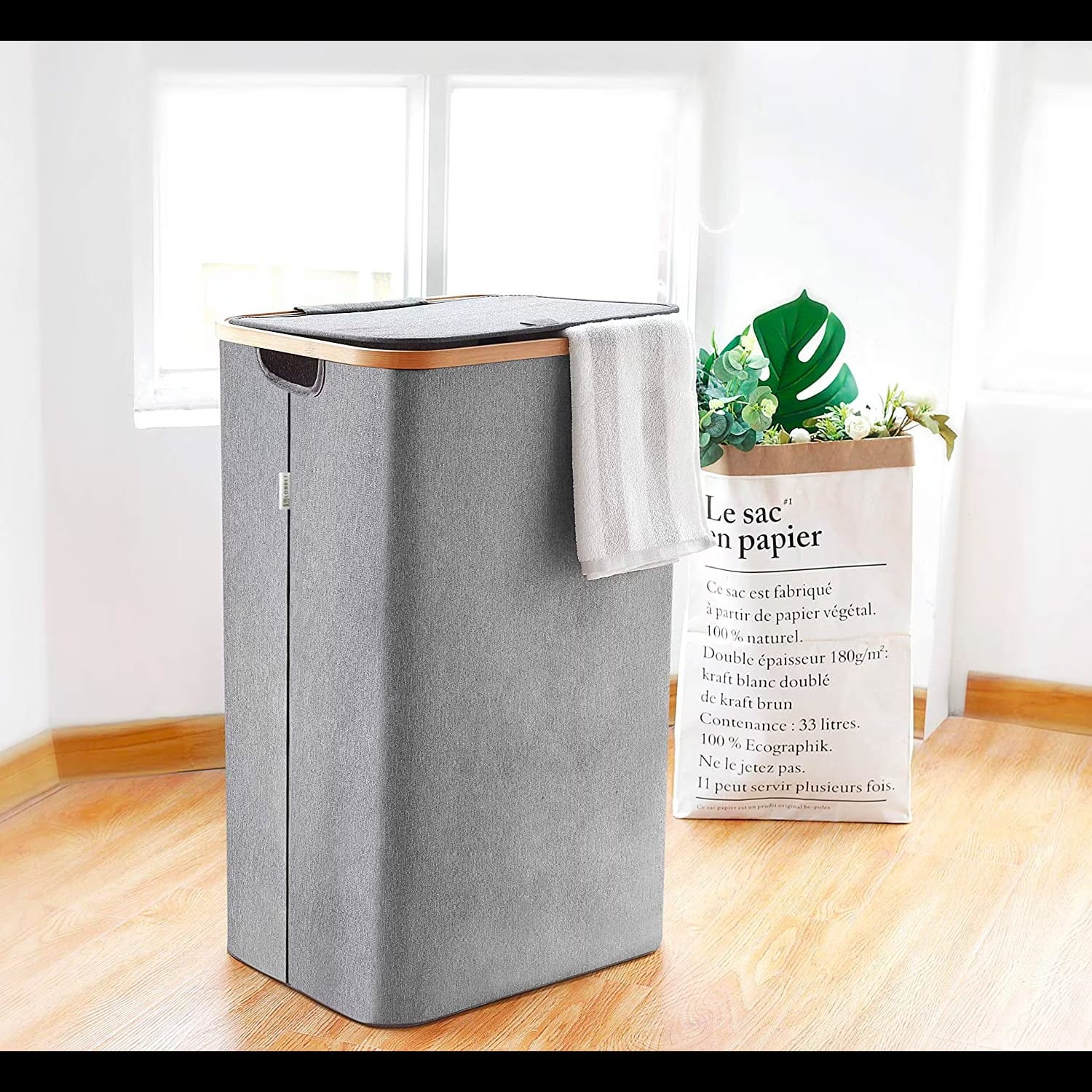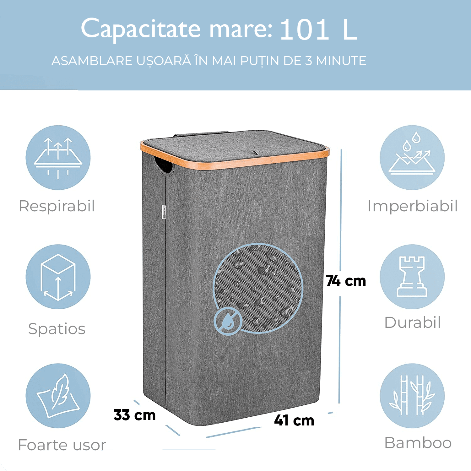 Cos de rufe bambus, pliabil, cu capac si sac de rufe detasabil, 101 L, 74 x 41 x 33 cm, material textil, Gri