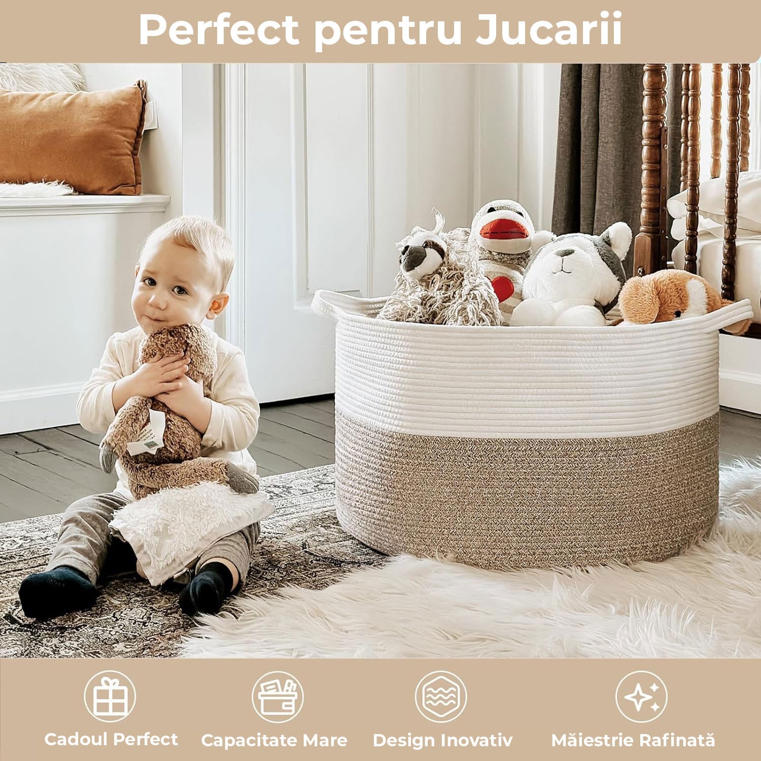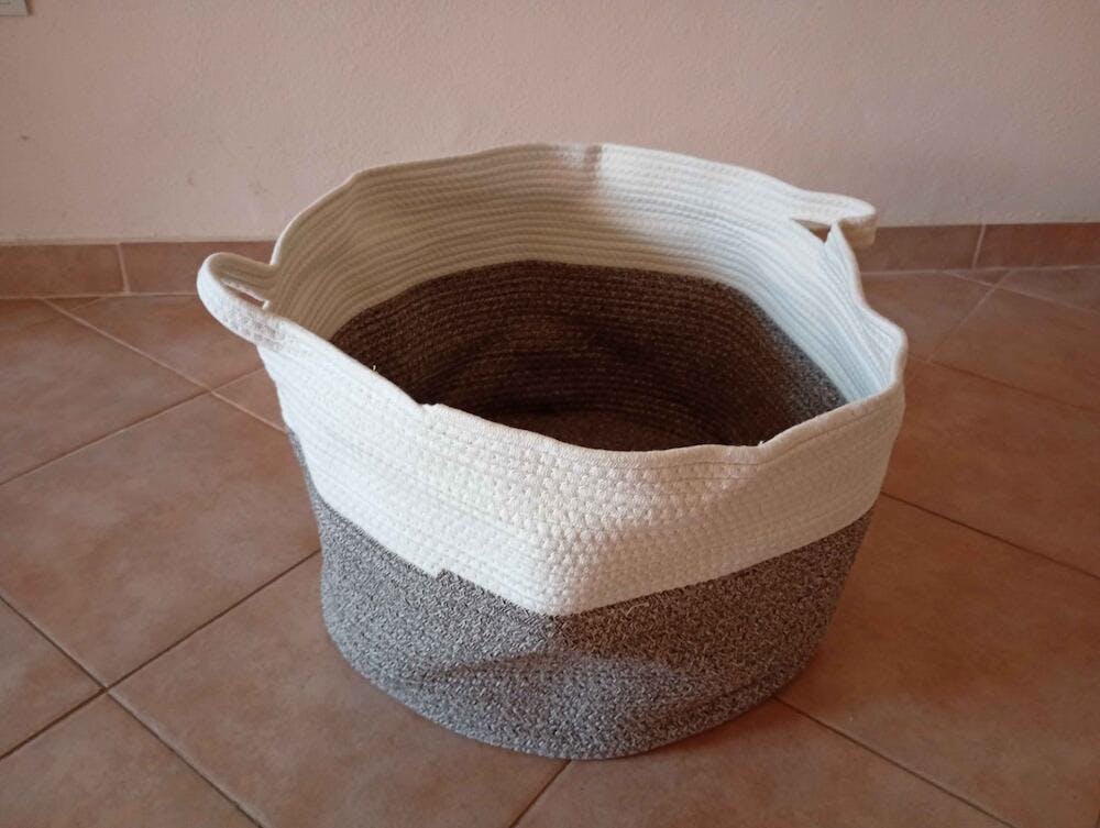 Coș mare cu mânere: Acest coș de rufe din frânghie este echipat cu mânere robuste, cusute cu fire dublu întărite. Poate susține obiecte grele sau poate fi tras cu ușurință.