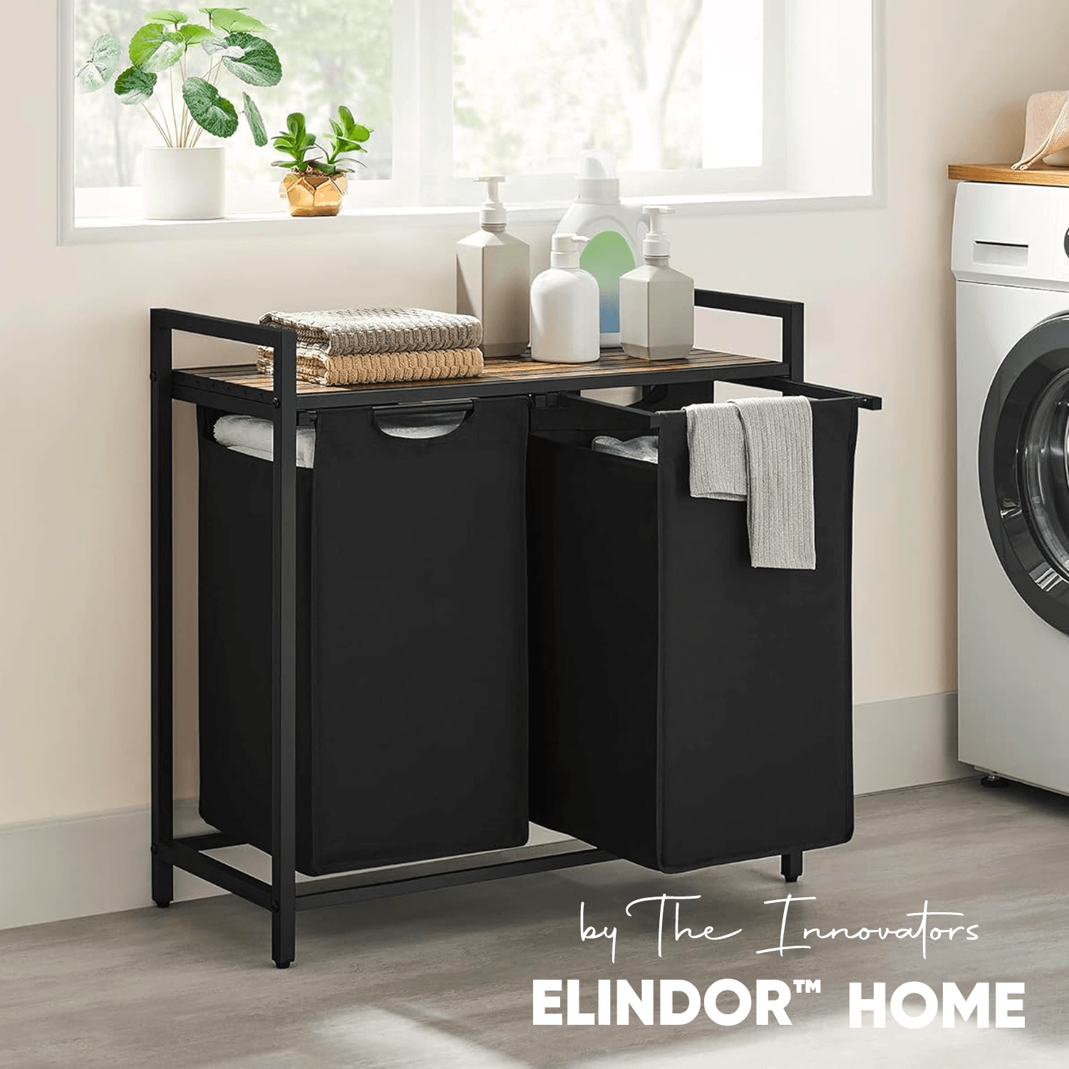 Coș de Rufe Dublu cu Sertar, Volum 92L, Raft Superior, Saculeti Detasabili, 73 x 33 x 72 cm, Negru