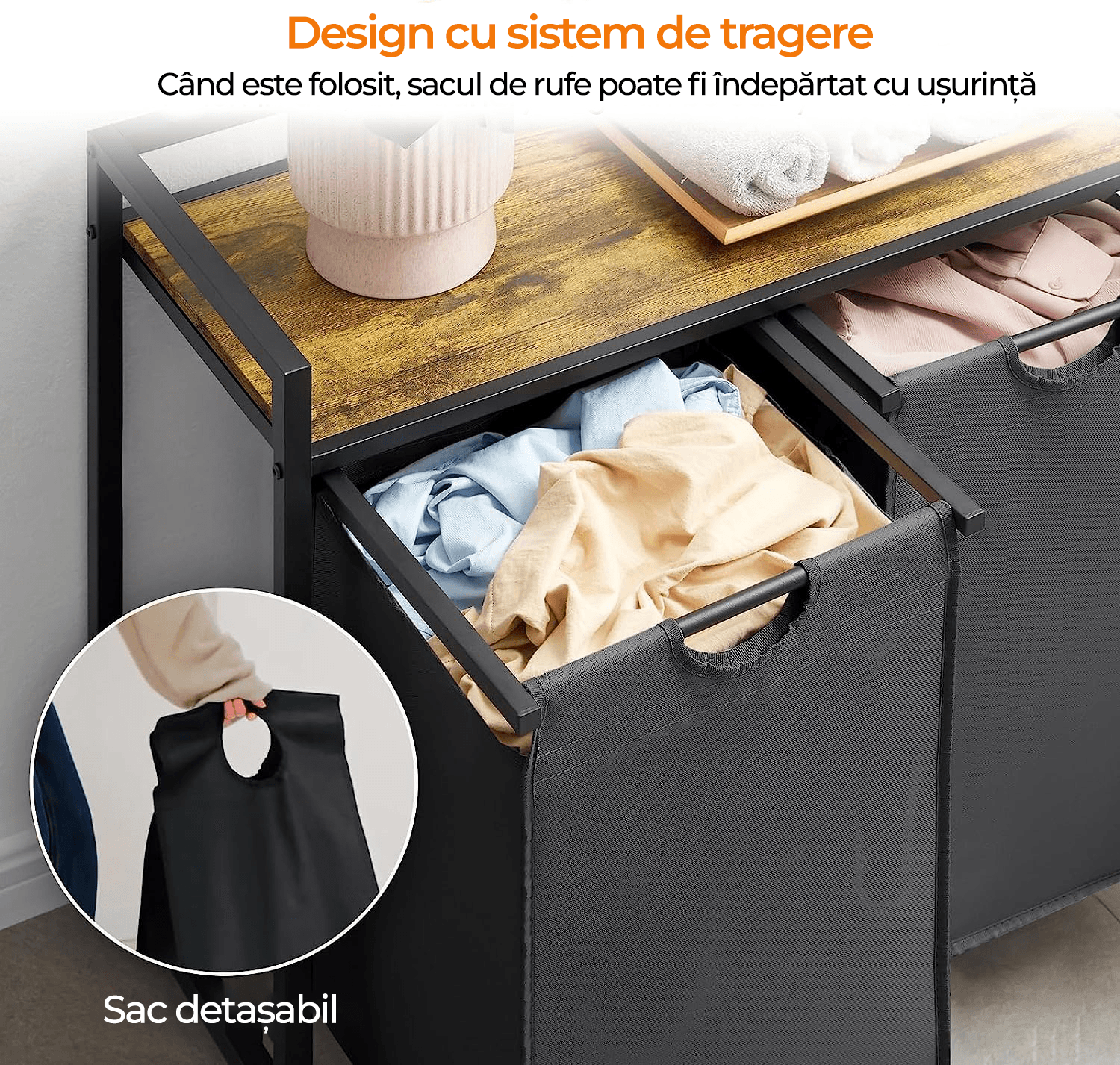 velcro pentru a scoate sacul de rufe, sau puteti sa-l trageti afara pentru a-l