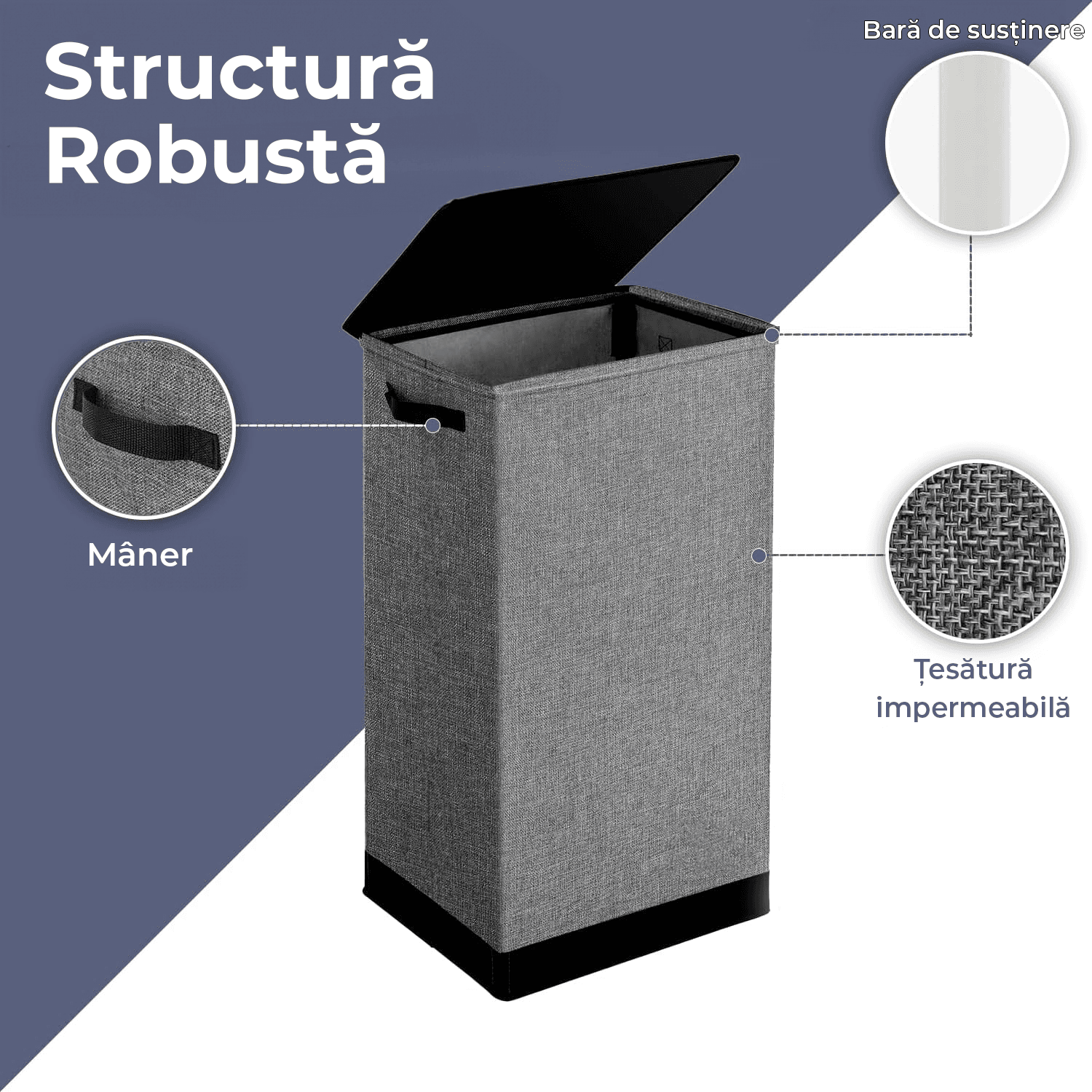 Durabil si Stabil: Cosul pentru rufe este construit cu tije consolidate, o baza robusta din MDF si un capac incadrat in metal. Perfect pentru utilizare intensa in case sau camine, stabil si durabil in timp.