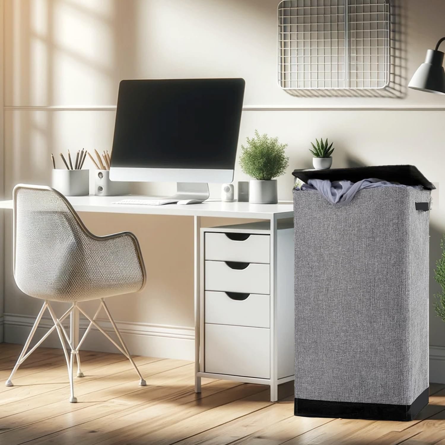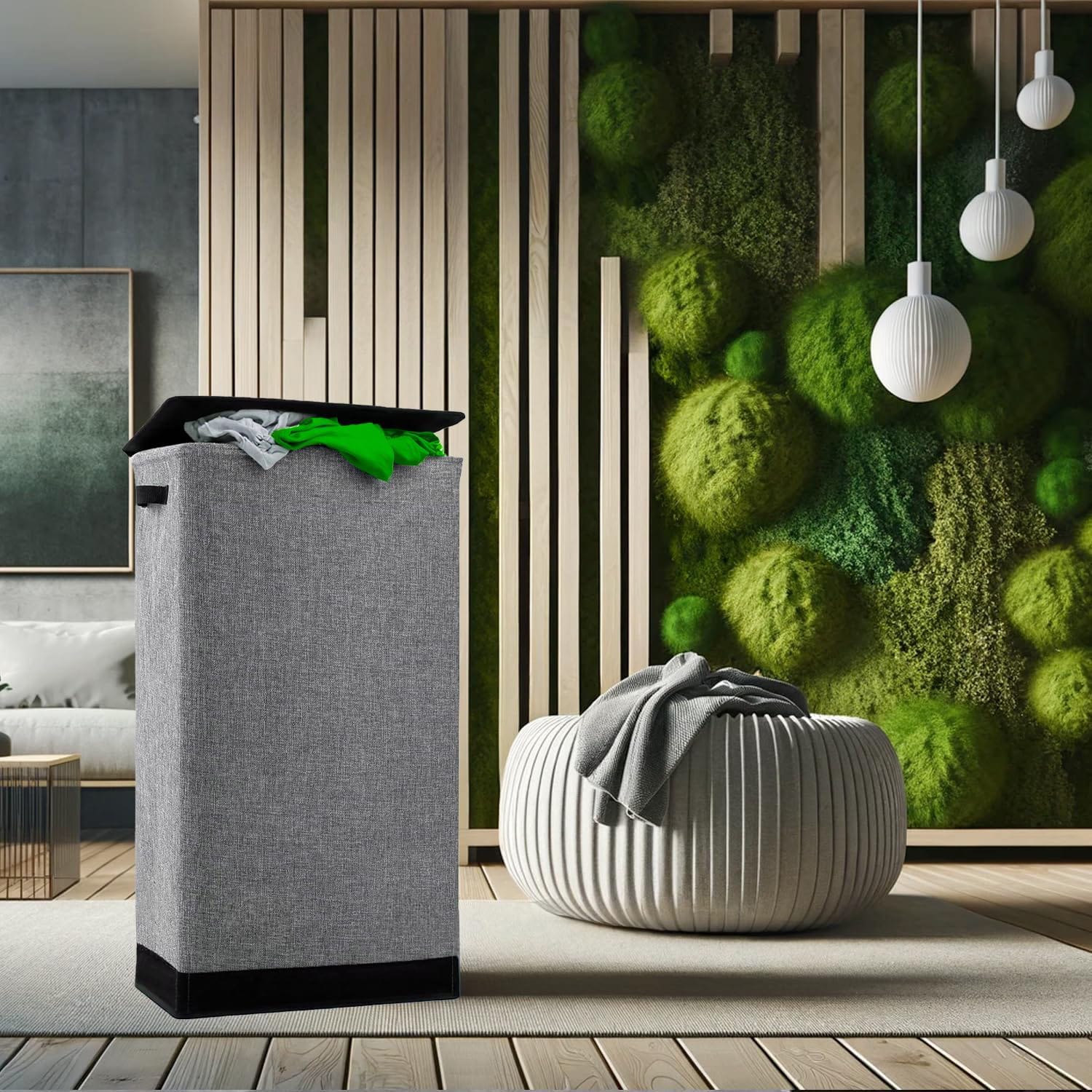 Design Elegant cu Caracteristici Practice: Cu un capac stilat pentru a ascunde rufele si un sac de plasa detasabil pentru transport usor, Cosul de rufe imbina designul cu functionalitatea, oferind o solutie eleganta pentru o casa organizata.