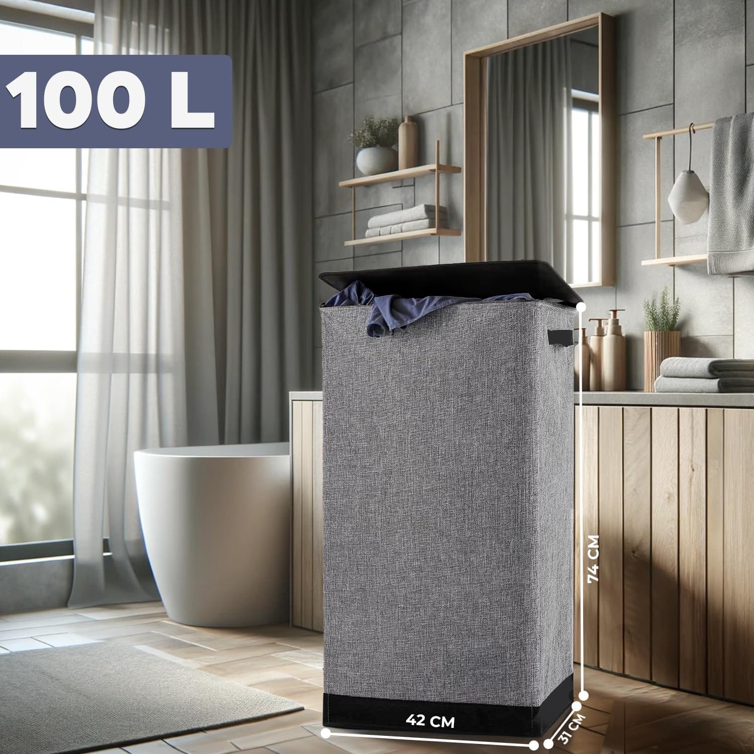 Capacitate Mare de 100L: Cosul de rufe are o capacitate mare: de 100L, dimensionat la 76 x 41.5 x 31.5 cm. Ideal pentru viata de familie sau pentru studenti.